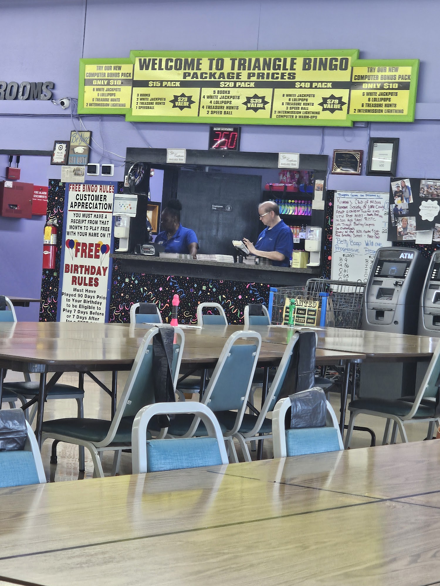 Triangle Bingo is a fun place with a great atmosphere and comfortable chairs. The staff and volunteers are extremely friendly, kind, polite, helpful, and accommodating. They help new players understand the games and cards. The games are great and you can win big money. However, the non-smoking room is very smokey, making clothes smell and affecting those with breathing issues. Some games are also way too fast, making it stressful to play multiple sheets. Despite this, it is considered the best bingo hall around, with good customer service that makes people drive an hour to return.