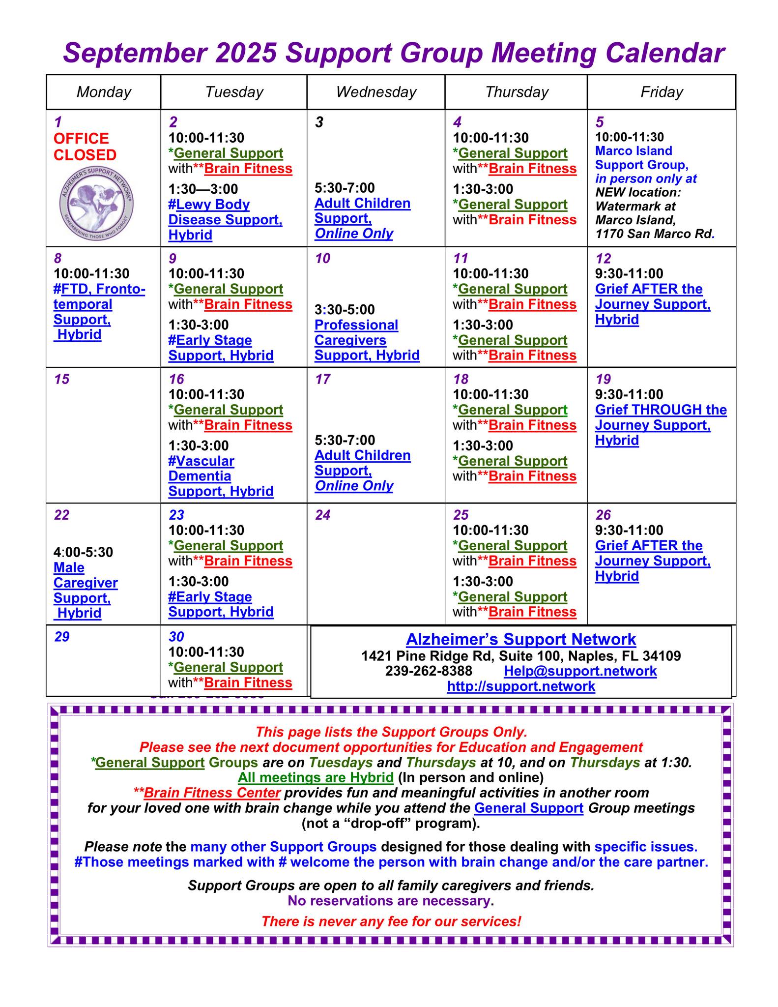 The Alzheimer's Support Network, Inc. is a 501(c)3 nonprofit organization founded in Collier County in 1982. They offer a wide range of services, including individual support, problem-solving with family consultants, over 30 support groups monthly (both online and in-person), educational presentations, and a wanders ID program in partnership with the Collier County Sheriff's Office. All services are provided free of charge. The organization has received overwhelmingly positive reviews from those who have utilized their services. Clients have praised the team's exceptional care, compassion, and willingness to go the extra mile to accommodate their needs. The support group has been described as incredibly kind and supportive, and the staff has been commended for their patience, clear guidance, and quick solutions to complex issues. The Alzheimer's Support Network is widely regarded as a lifesaver for families dealing with the challenges of brain decline in seniors.