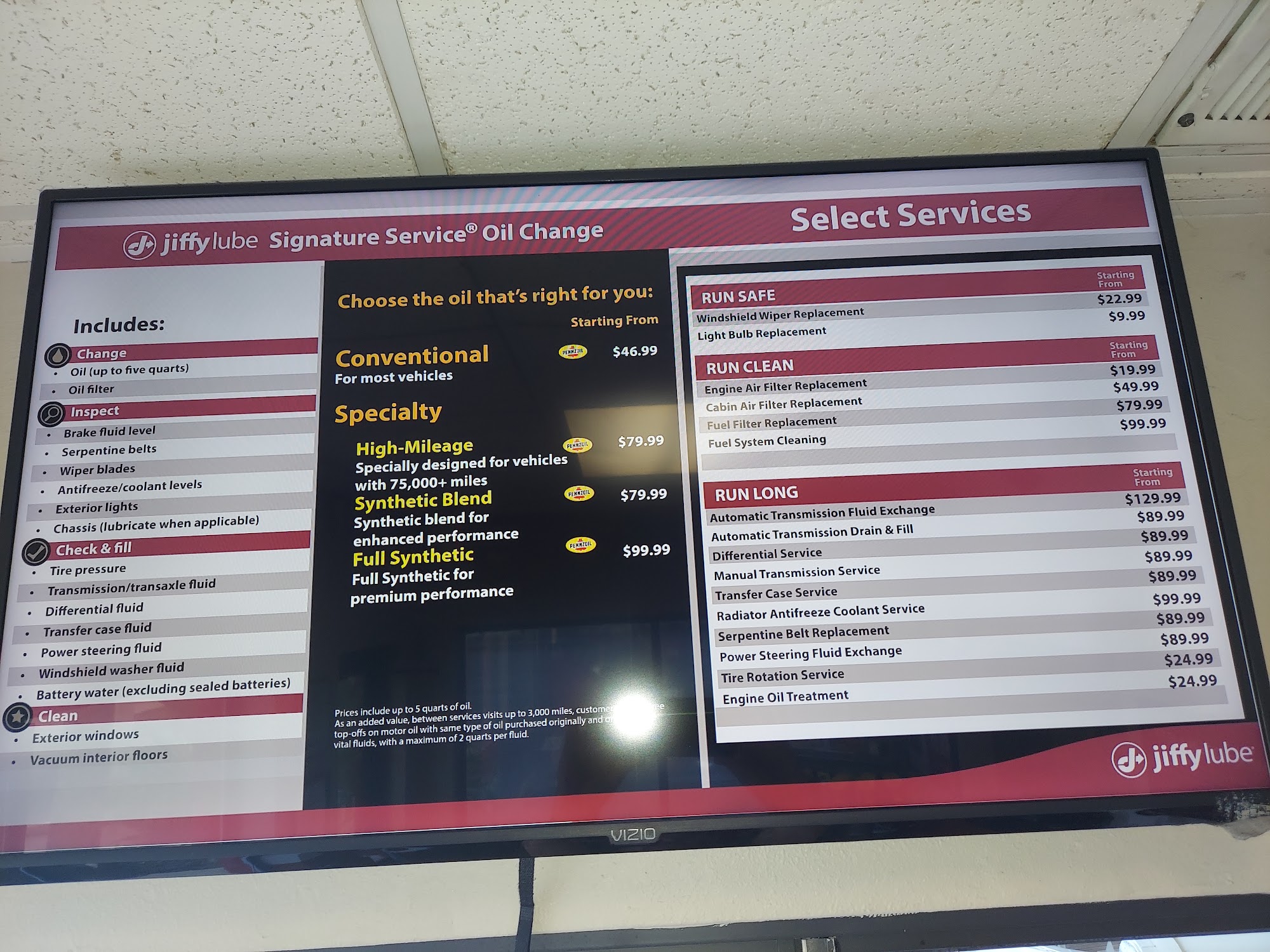 Service included lube, topping off all fluids, tire pressure check, etc.