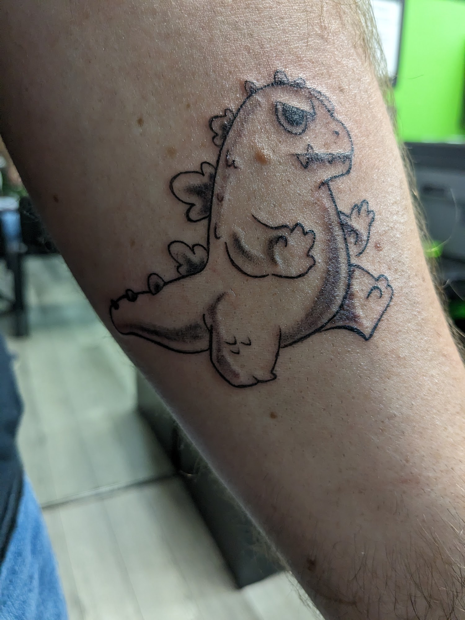 Shay is an amazing tattoo artist. Clean shop. Always busy. Great communication. Two more then I'm done. Highly recommend. Stitch and Scrump in memory of my mom.