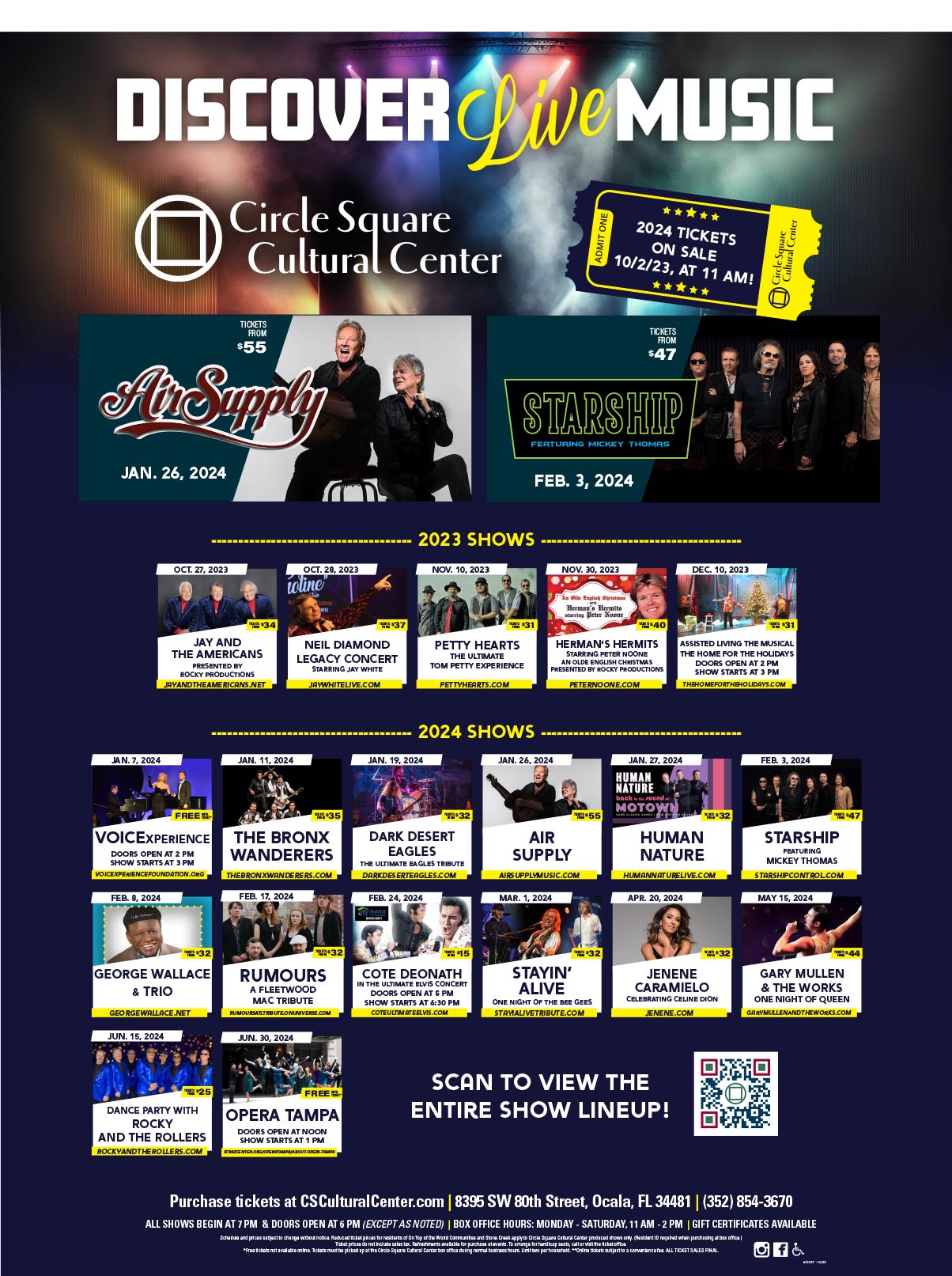 Circle Square Cultural Center (CSCC) at Circle Square Commons brings top name live entertainment to Ocala, Florida, featuring spectacular events and performers every year. With seating for up to 930 guests (theatre style), you’ll have an incredible concert experience in this unique intimate setting. In addition to concerts, CSCC is a spacious indoor venue for banquets in Ocala; seating up to 600. This beautiful auditorium also hosts dances, conventions, expos, fundraising events, and more.