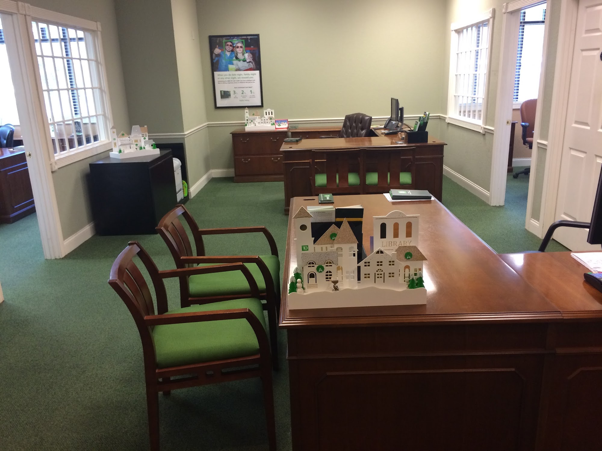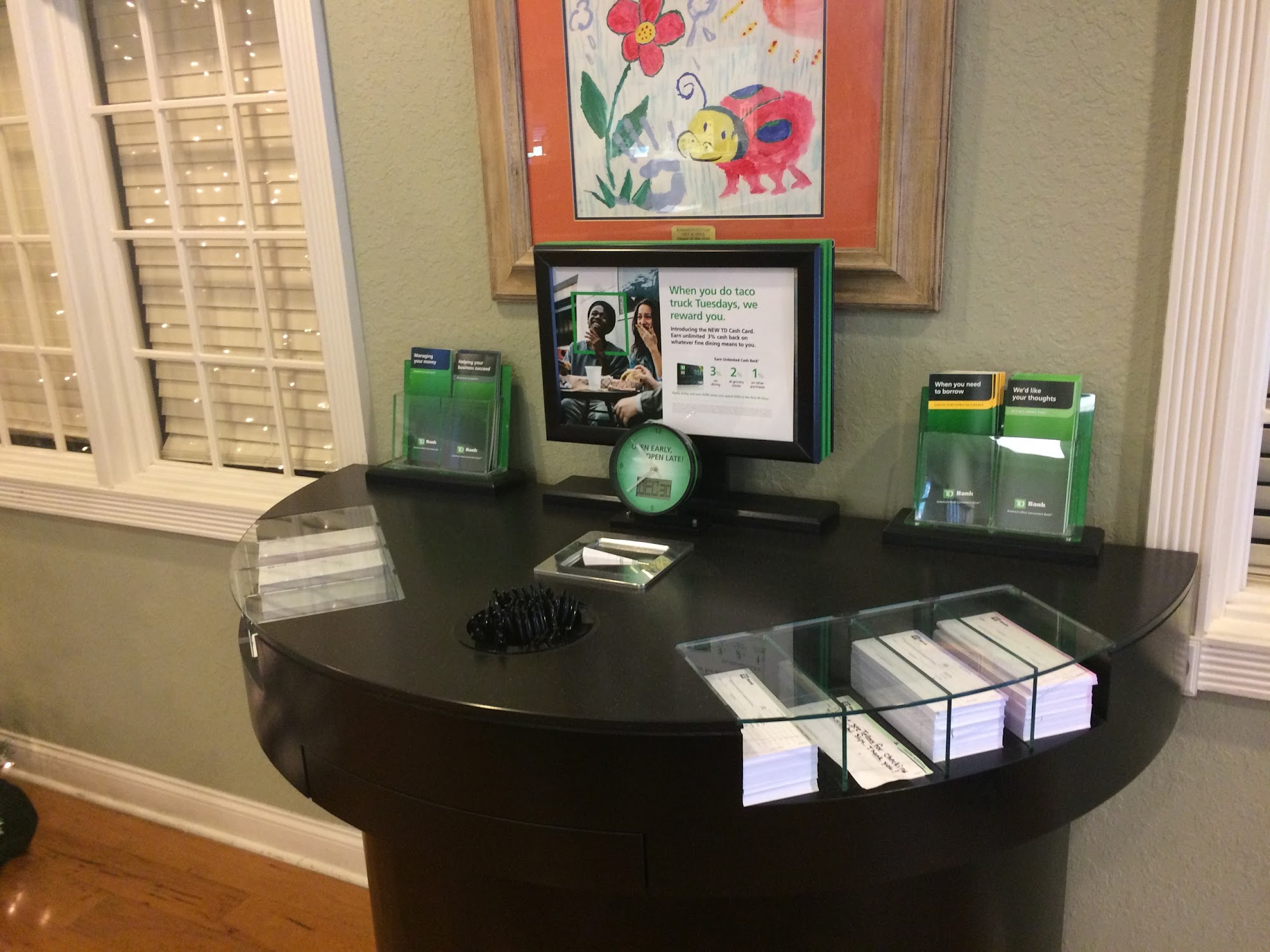 Friendly, efficient and very helpful tellers, well-staffed, clean. Short wait times if any in the lobby. Td offers a perk for 2 day early automatic deposit withdrawal for their customers. Very pleased to have opened up an account.