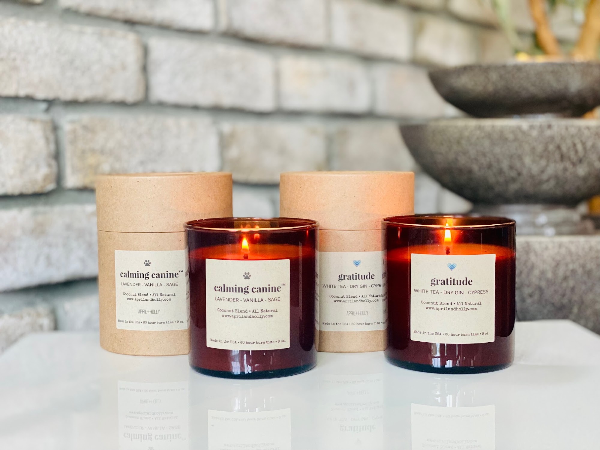 All-natural nontoxic coconut blend, vegan candles. Made in the USA. First in Canine Candles. APRIL + HOLLY is a women owned and operated all-natural small batch candle brand. Our non-toxic candles are made with a coconut oil blend, 100% cotton wicks, and are handcrafted in the USA. You can burn our candles with confidence in knowing you are creating a warm atmosphere and non-toxic environment for your household while also sharing your light with others through our Giveback Promise.