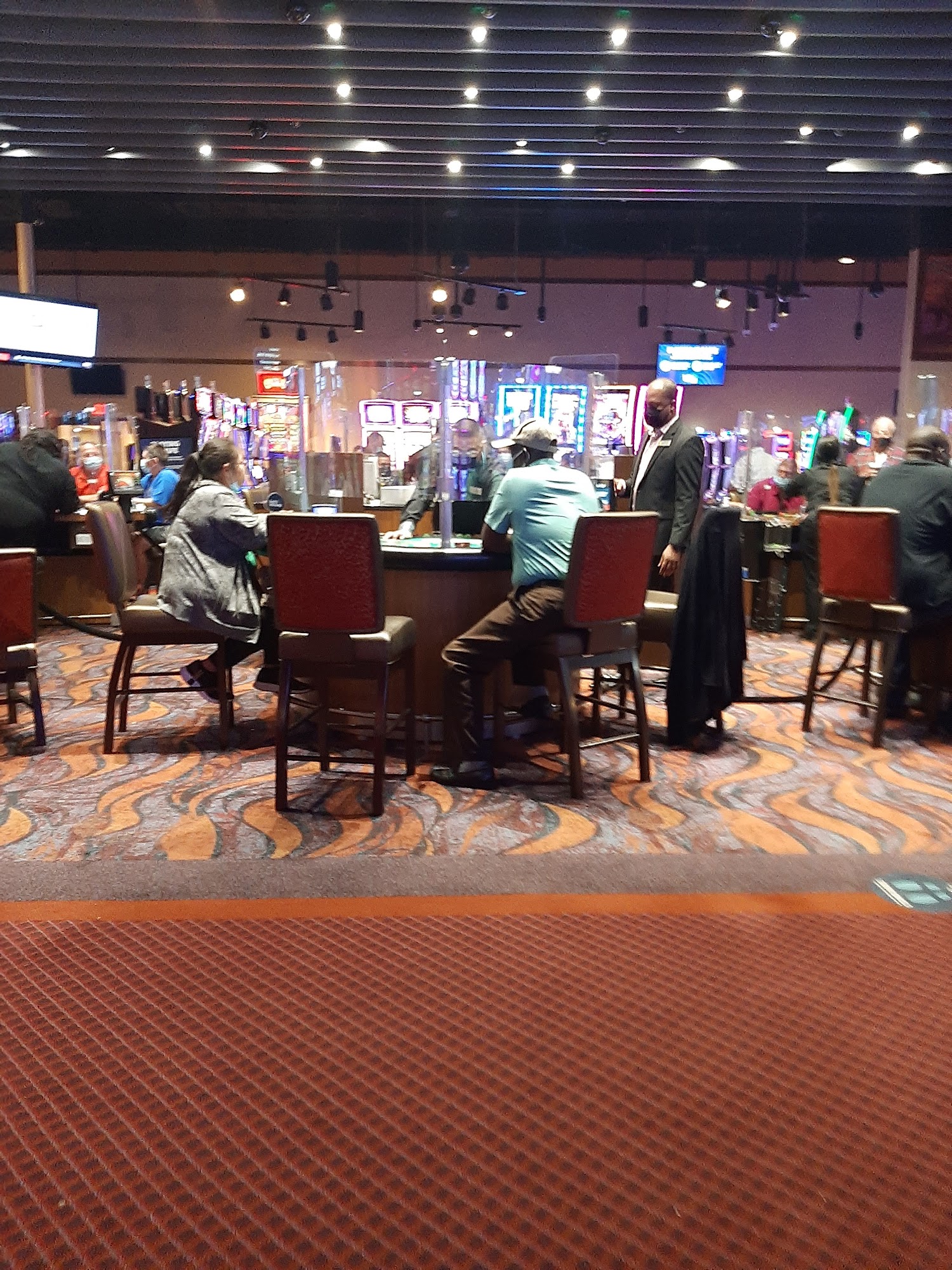 Located away from everything. This is a new building, clean, fresh and nice. Wished they would have made it all non smoking with the smokers having a smaller room. Do the opposite of what it is now.