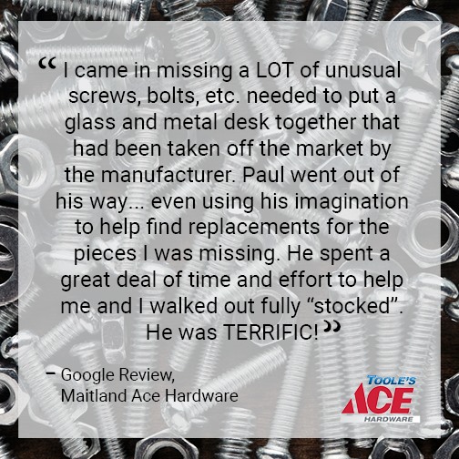 Aries the store manager was the best and most helpful service staff I’ve ever seen at any ACE Hardware. Saved my day…. Thank you Aires.