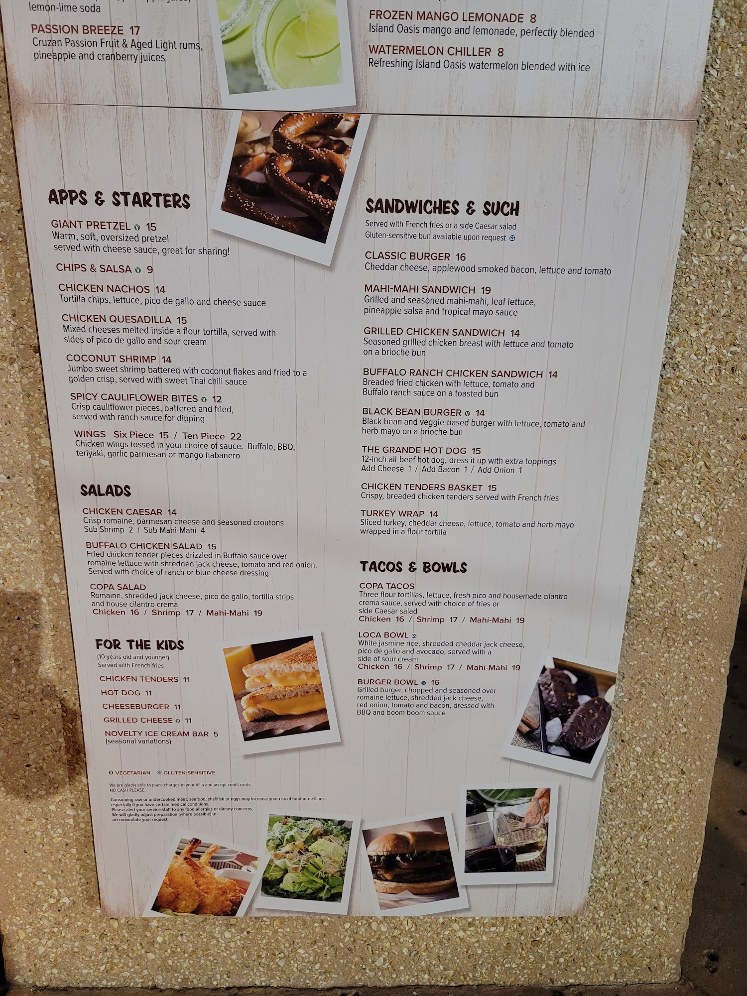 Excellent food a drinks at the Marriot. Enjoy the pool and hottubs while having a drinks and some excellent food. Staff is always friendly and service is great. Most major sports are on the TVs and lots of activites for adults and kids to do.