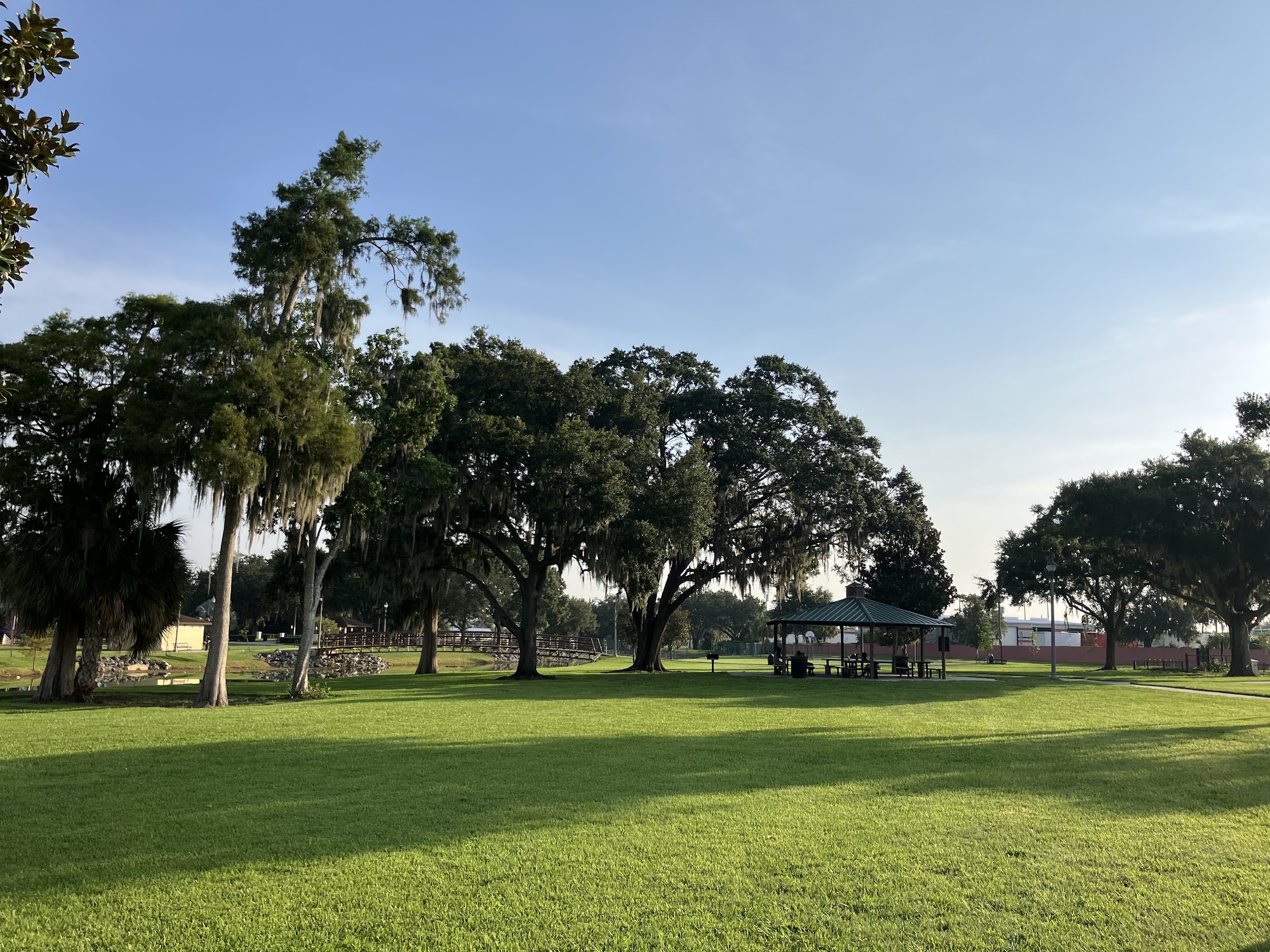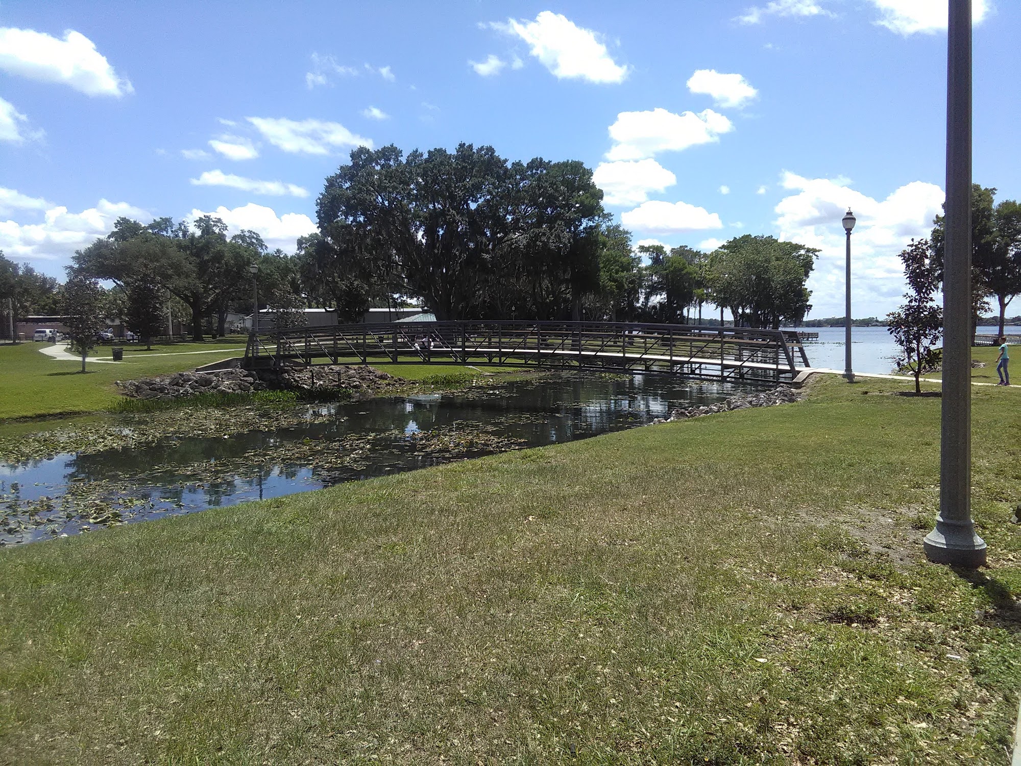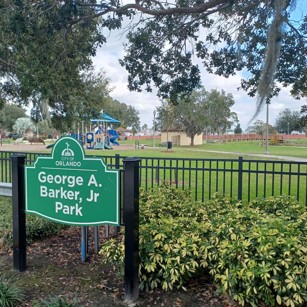 George Barker Park is a charming park located near downtown Orlando, perfect for relaxation and recreation. The park features a beautiful lake, making it an ideal spot for boating and fishing. Visitors can enjoy picnics at the clean picnic tables and use the available grills. The playground is quiet and well-maintained, providing a safe space for children to play. The park is dog-friendly, with dogs often seen on leashes, contributing to the peaceful atmosphere. The park's green grass and scenic views of the lake enhance its appeal, although some trash can be present. Facilities include clean restrooms, although they lack lighting inside. A notable feature is the impressive bridge over the water, offering a pleasant walking experience. Additionally, the African-American Farmers Market adds a unique touch, with local goods available for visitors. Overall, George Barker Park serves as a valuable community space, blending recreation with tranquility in a lovely setting.