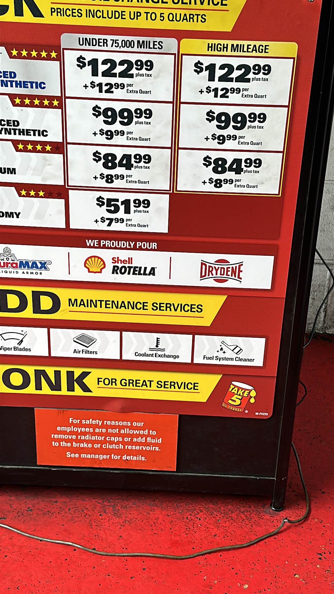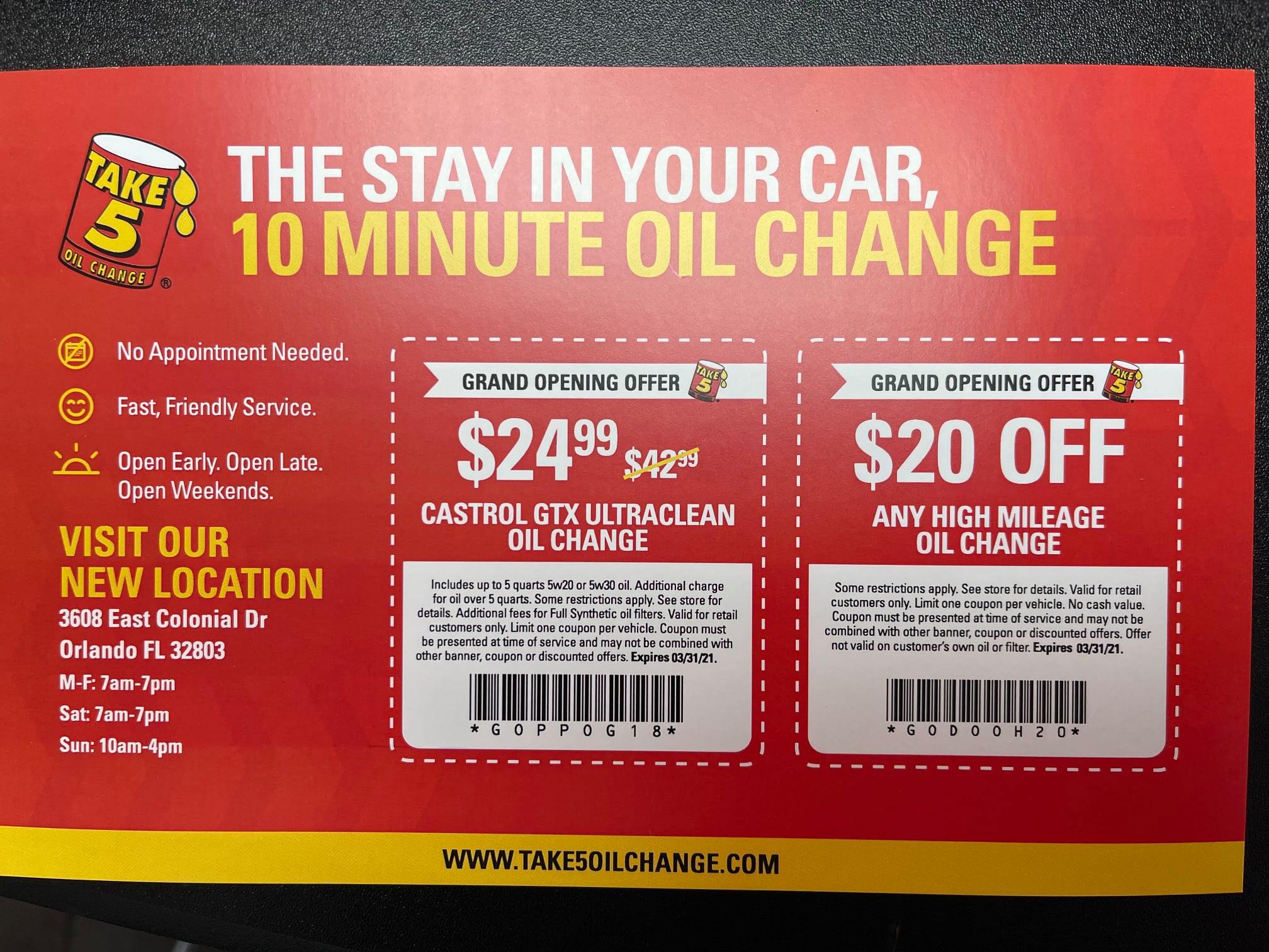 Take 5 Oil Change is a go-to for fast and simple oil changes in Orlando, getting customers back on the road quickly. The service is excellent, fast, and efficient, often completed in under 20 minutes for a 10-minute stay-in-your-car oil change. The staff and friendly technicians are polite, quick, and know what they are doing. They provide great and awesome customer service, keeping customers informed and comfortable with a step-by-step breakdown of the work. They perform a full check on the vehicle, checking all fluids and everything, including free tire pressure checks and fluid top-offs. They kindly recommend required necessities for the engine to run more efficiently and provide information on results if not done. The service also includes windshield wiper replacements, air filter changes, coolant exchanges, and more. Customers appreciate the honesty, thoughtful service, and high standard, which provides peace of mind. The experience is consistently awesome and strongly recommended.