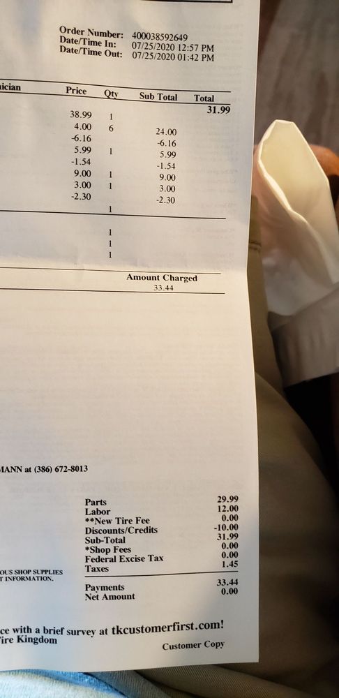 I honestly had a great experience.. I came home found a flat .. ended up having to get a new tire .. but the OG at counter who I honestly don’t remember his name was a cool guy . Made it not so bad . Offered me a veterans discount too