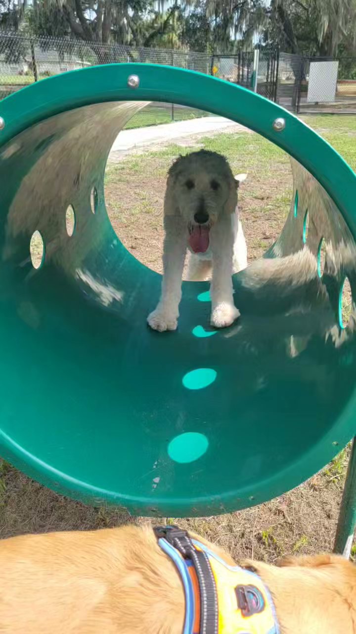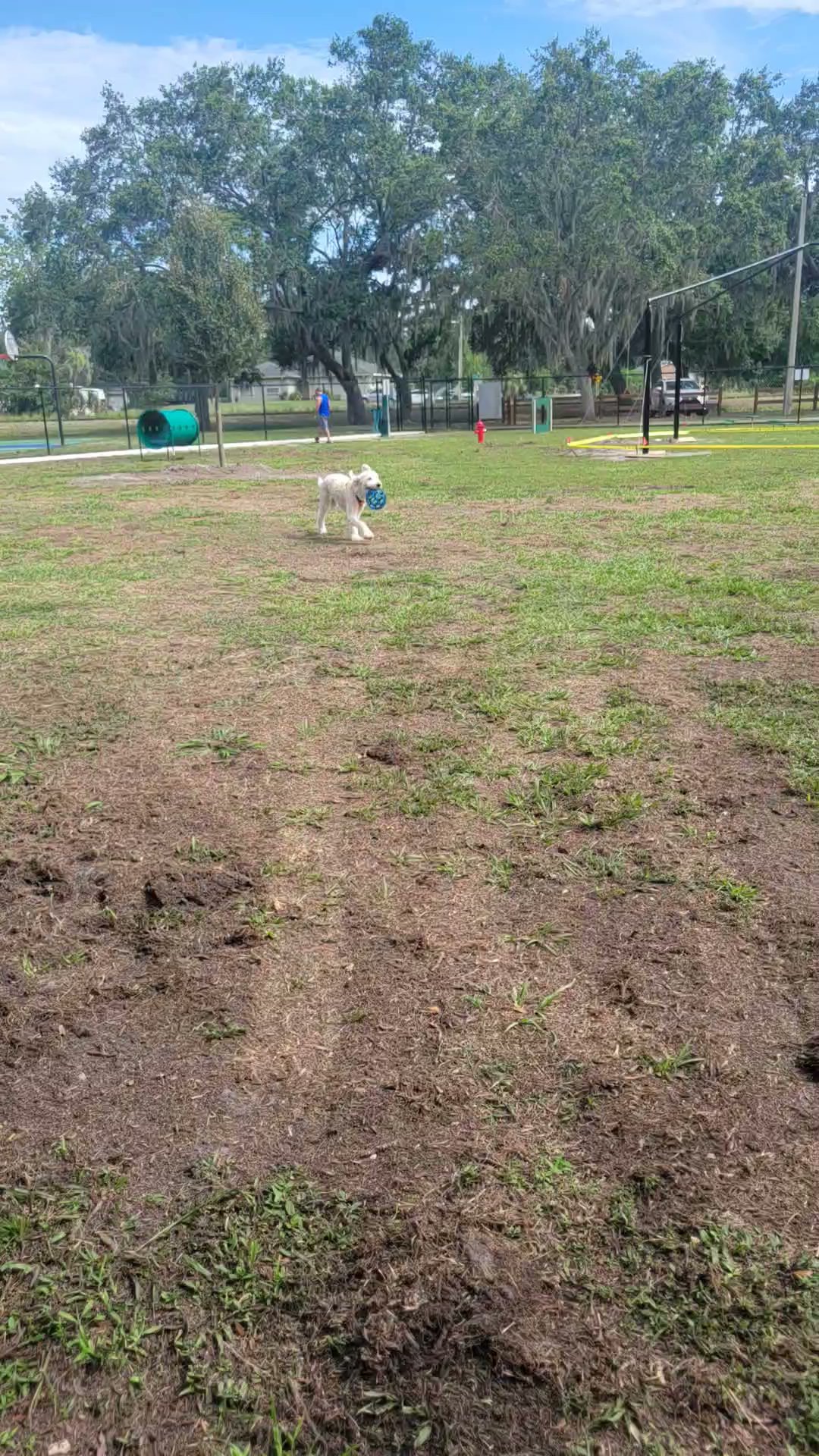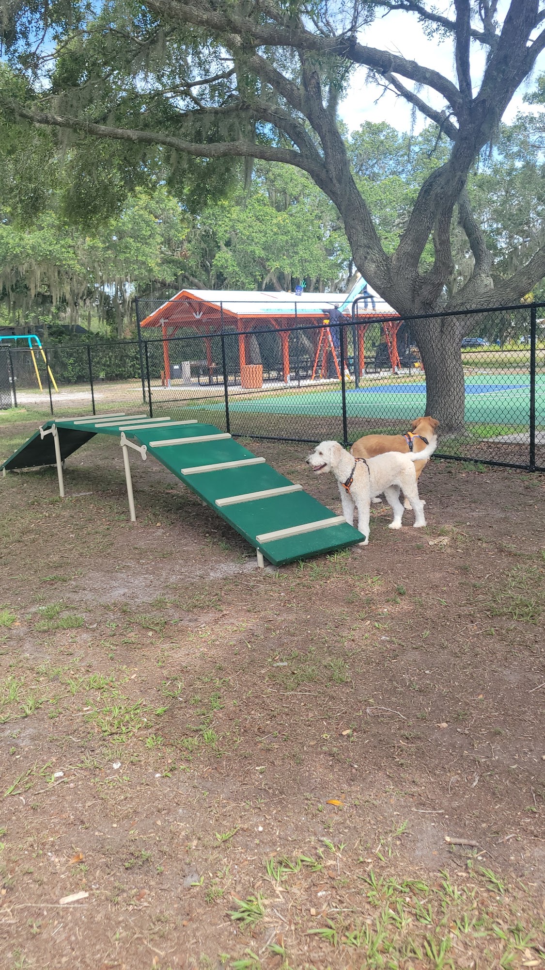 Decent little park. Two dog areas separated by a fence. Both sections have basic agility obstacles in them but not a full agility course.