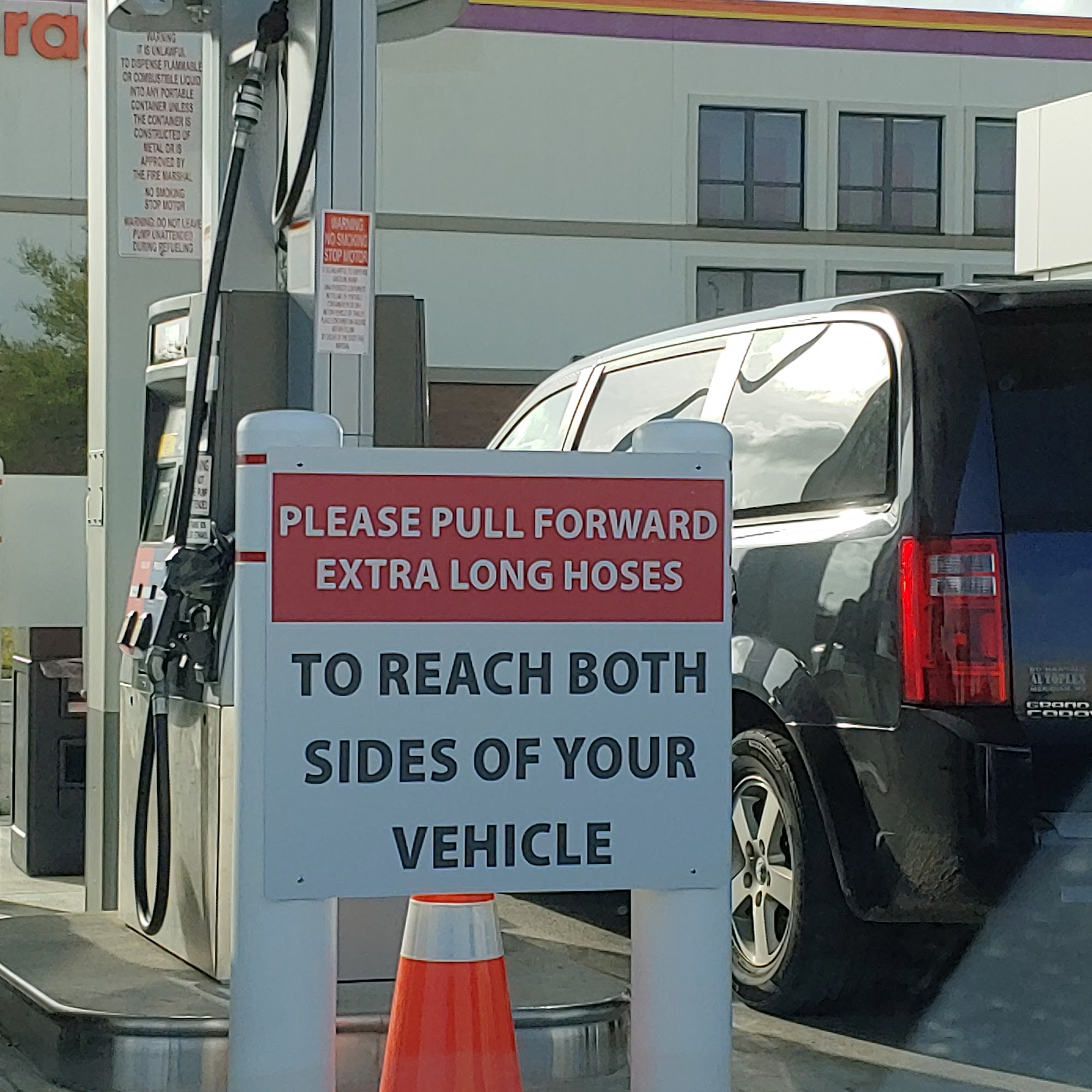 Gas prices lowest I have seen in town. Extra long pump hose makes it easy no matter what side you gas tank is on.