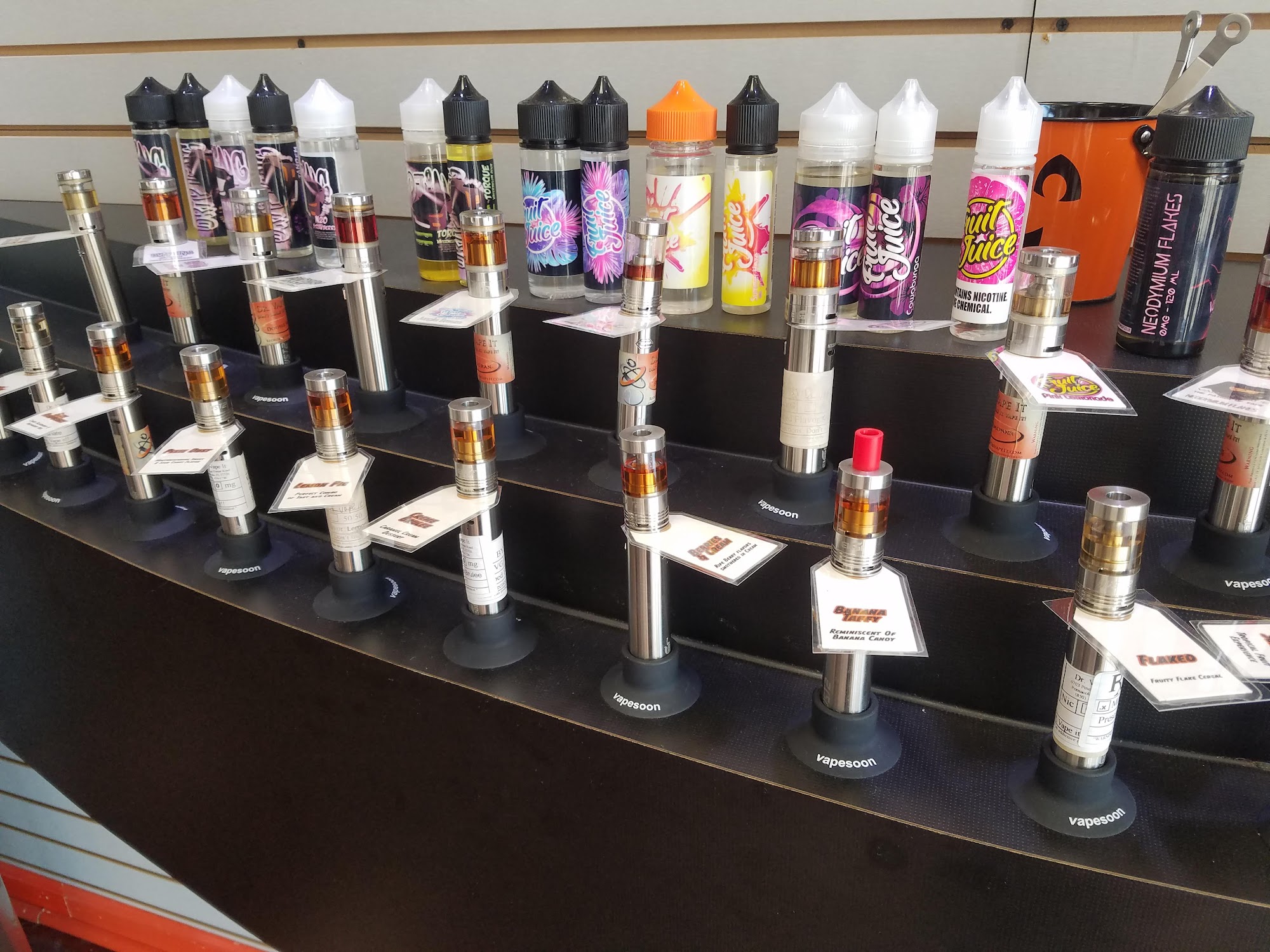 They have recyclable bottles for the in-house vap juice! The gentleman that makes my mix has great recommendations and is very polite. There is no pressure to make a sale and is very informative about alternative juices. One step closer to staying off ciggerates for good?