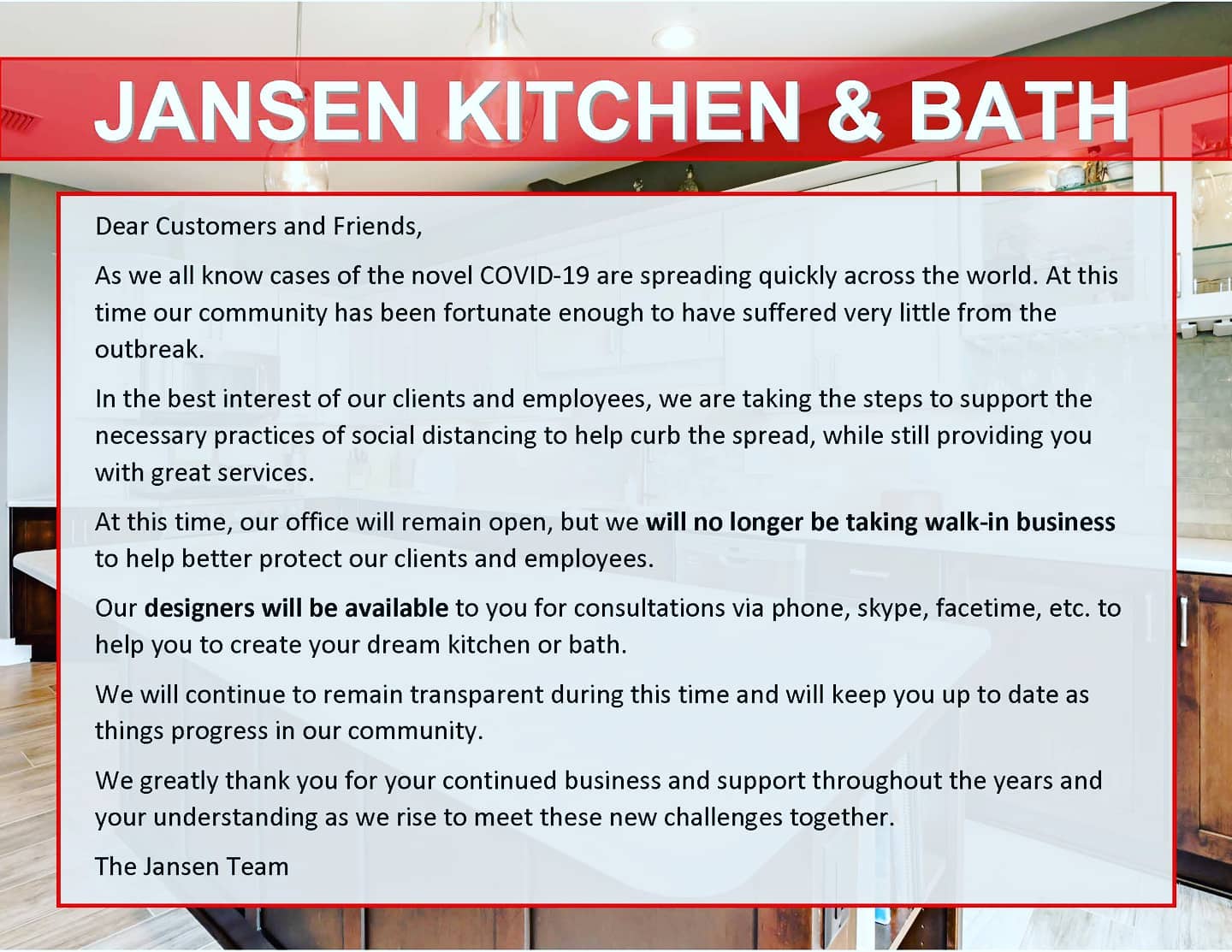 The team at Jansen have remodeled my master bath, laundry room and kitchen. They did an excellent job on all three. Very responsive to all my requests and kept me informed all during the projects.