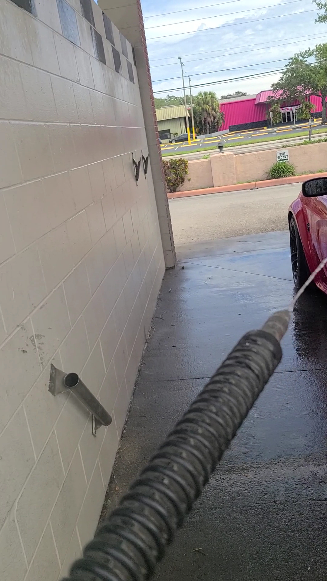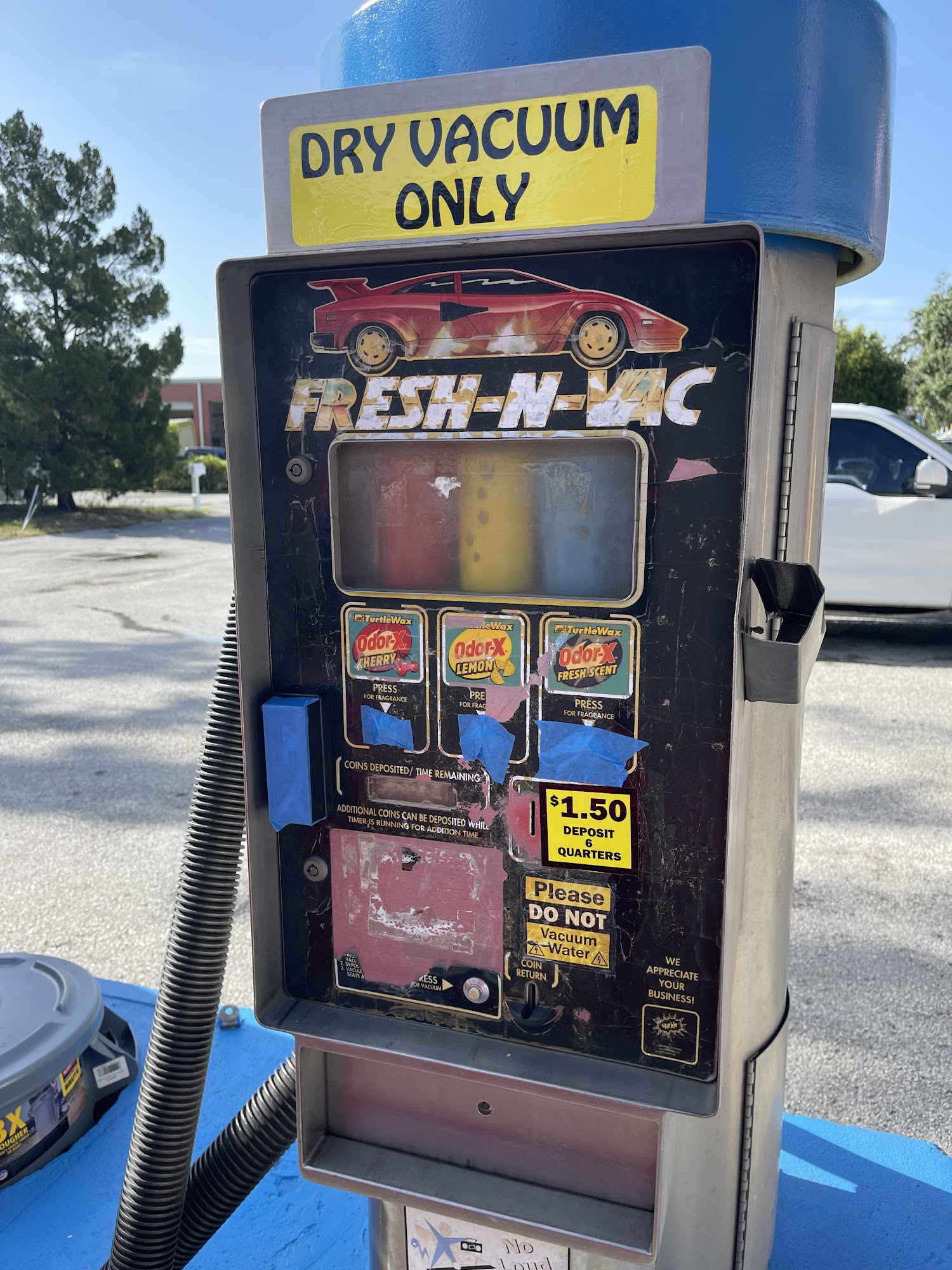 This is a cheap car wash so don't expect much out of it. It's also a self-service car wash. There were no towels available at the vending machine so either bring your own or you will end up with spots and streaks on your car from the wax and stuff. Also, bring a bunch of quarters because it doesn't accept credit cards
