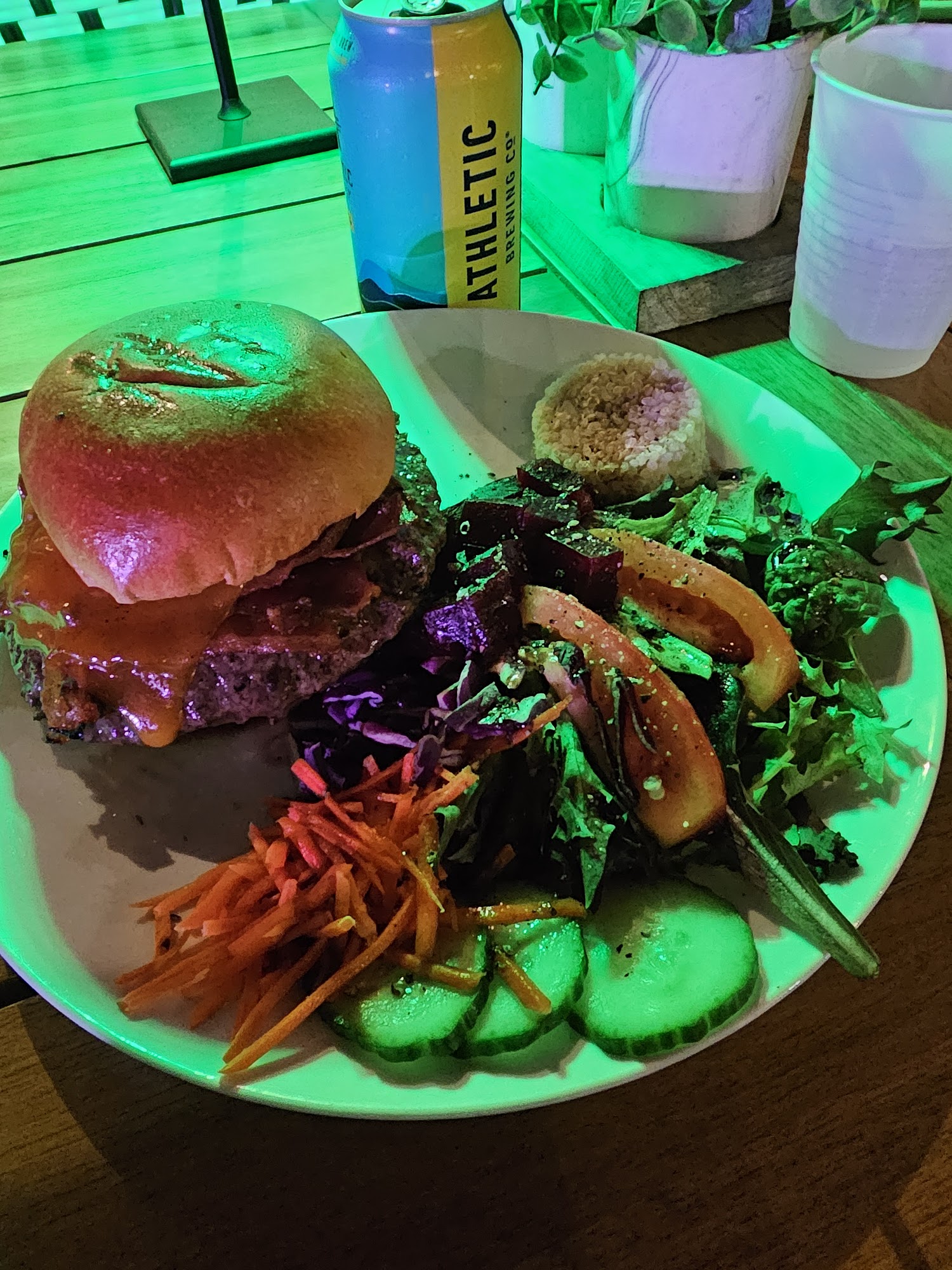 Kobs Green Market is a grocery store and cafe focused on healthy, natural, and organic nutrition. The food is amazing and crazy good, using super high quality organic ingredients. Menu items include Wahyu burgers, salad bowls, steak, cookies, smoothies, and sea moss lemonade, all described as second to none. It is a wonderful spot with a pleasant atmosphere, offering great food and drink for breakfast, lunch, and dinner. The service and staff are amazing, with lovely owners who provide excellent customer service. It is a must-try and a good place to eat healthy food, beating all expectations.