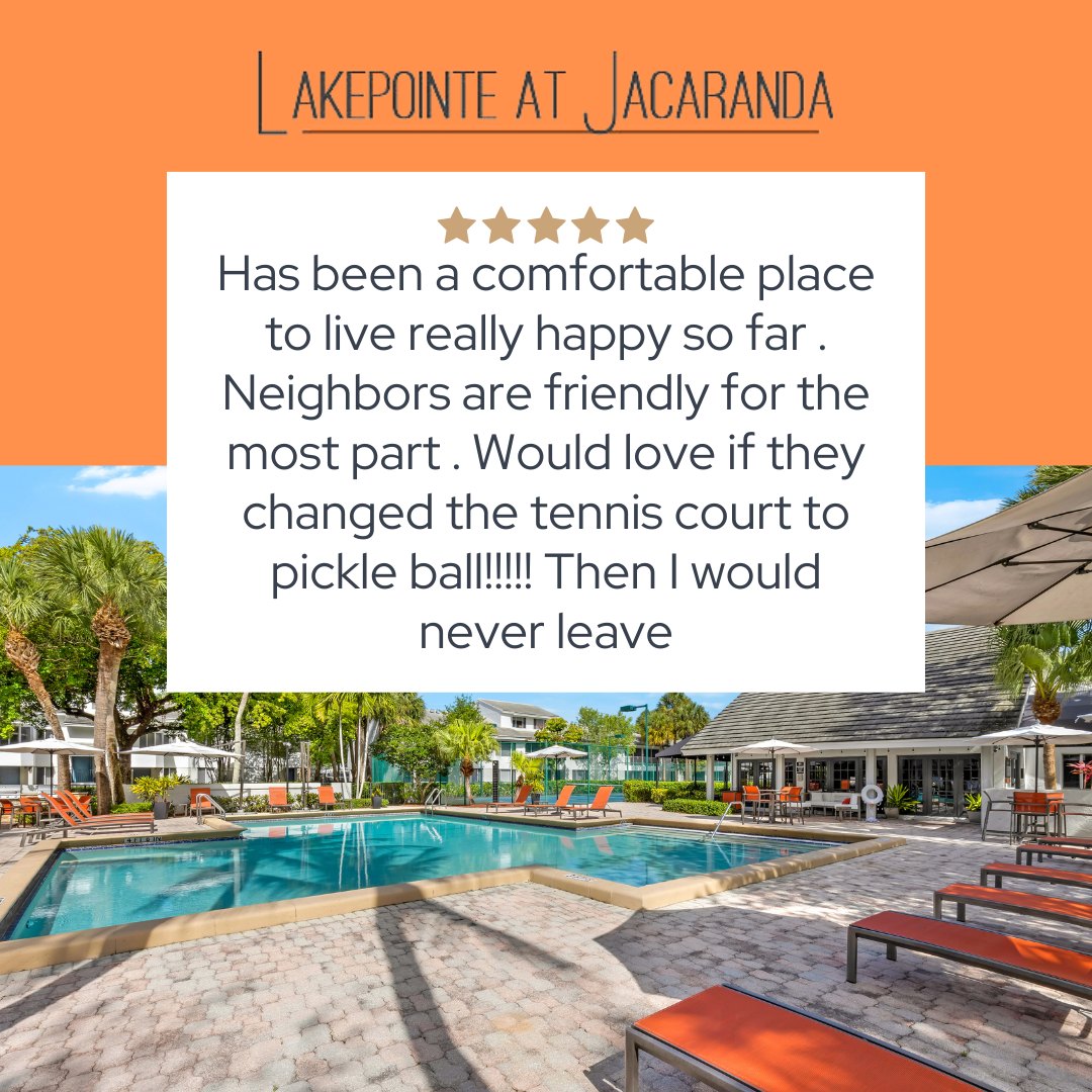 We stayed at Lakepointe at Jacaranda for a year. The ladies in the office are amazing and helpful. Always very responsive. The maintenance men were also phenomenal and completed our requests in a timely manner! Would recommend!!