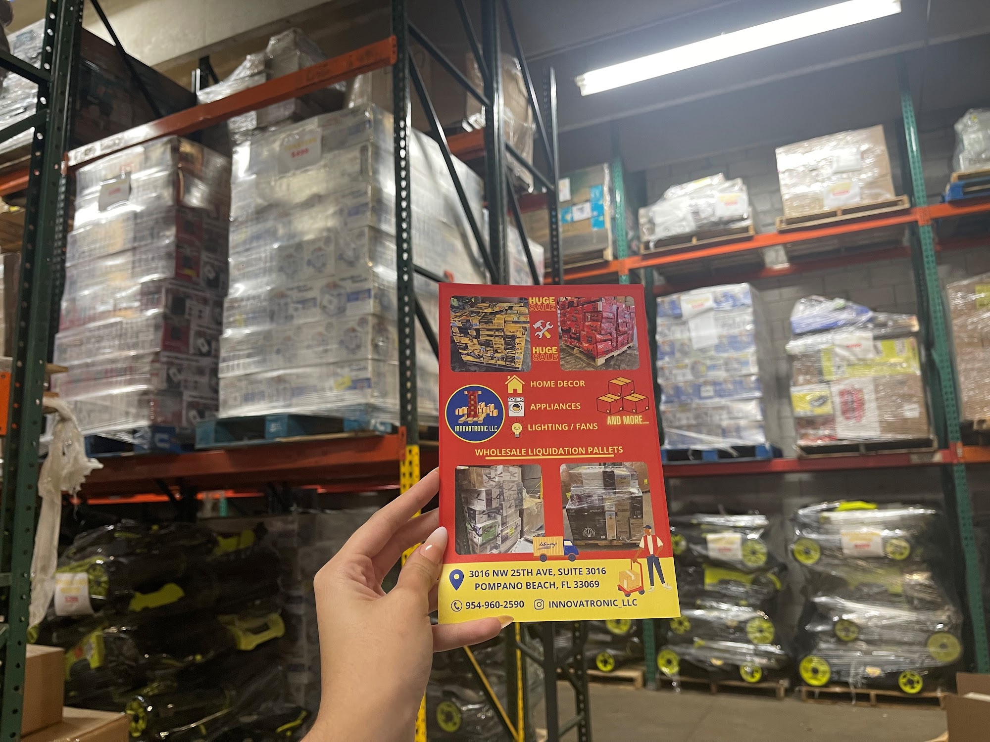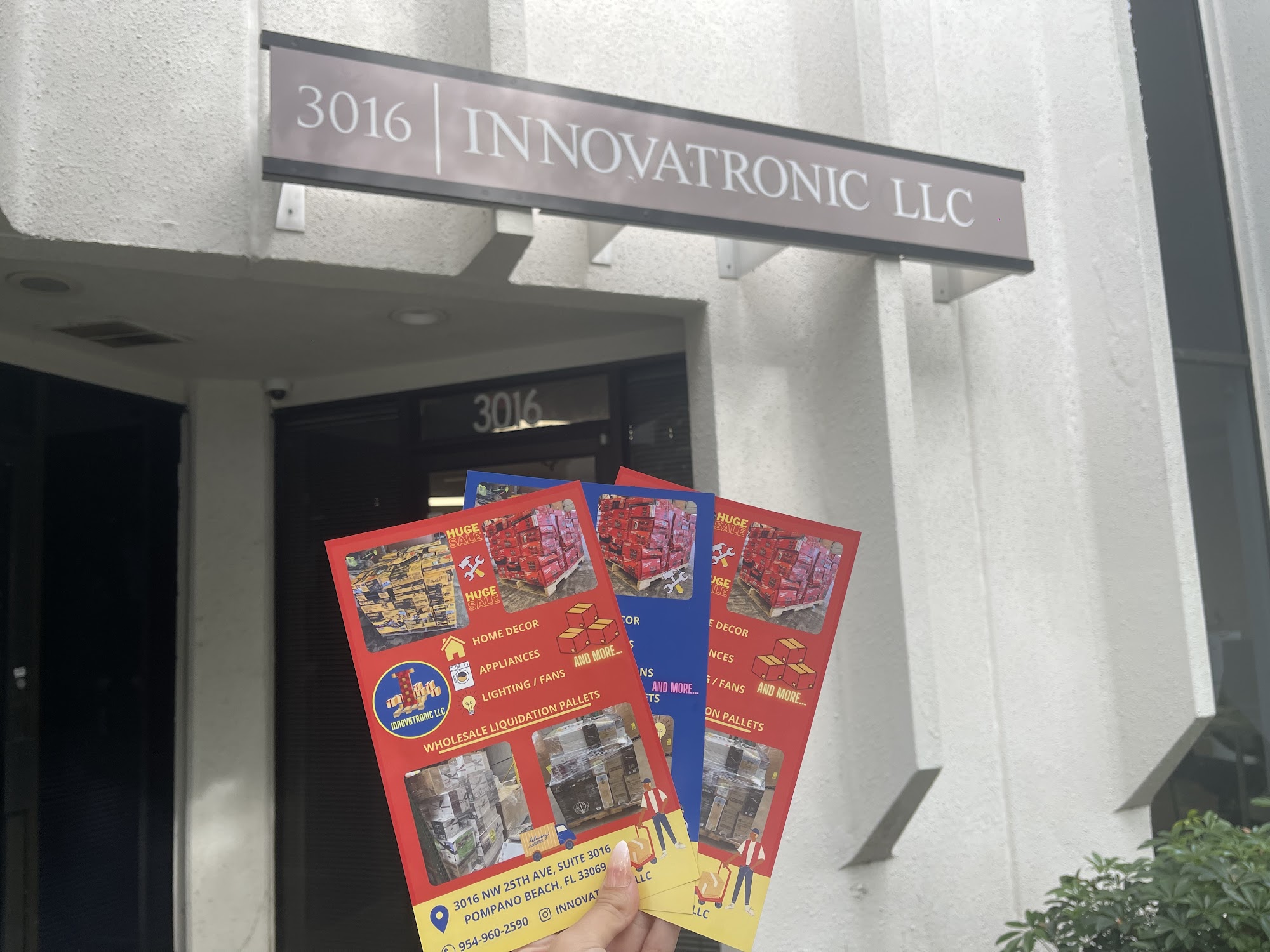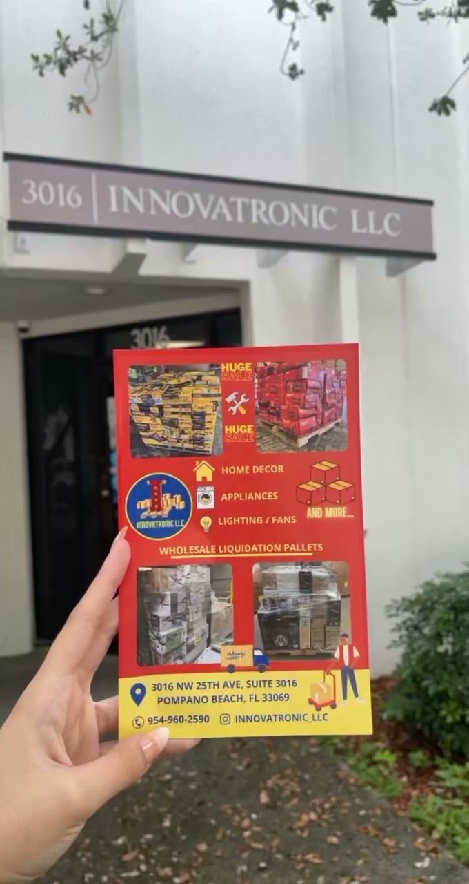 INNOVATRONIC LLC IS A WHOLESALE AND RETAIL COMPANY WE SELL WITH GUARANTEED PURCHASE MANIFEST, INVENTORY MERCHANDISE, WITHOUT DAMAGE OR IMPERFECTIONS, WE SHIP THROUGHOUT THE UNITED STATES AND LATIN AMERICA. SPECIAL PRICES FOR RESELLERS WE HAVE TOOLS, KITCHEN FURNITURE, PATIO FURNITURE, PLUMBING, ELECTRICITY, ELECTRONICS, SECURITY, GRASS CUTTERS, LIGHTING, REFRIGERATION AND AIR CONDITIONING, MATTRESSES, DECORATION, APPLIANCES, HOME AND DESK CHAIRS, FANS, BLINDS, CARPET CURTAINS, CERAMIC FLOORS, WOODEN FLOORS, SPECIFIC MERCHANDISE FOR THE CONTRACTOR AND BUILDER AND MORE.