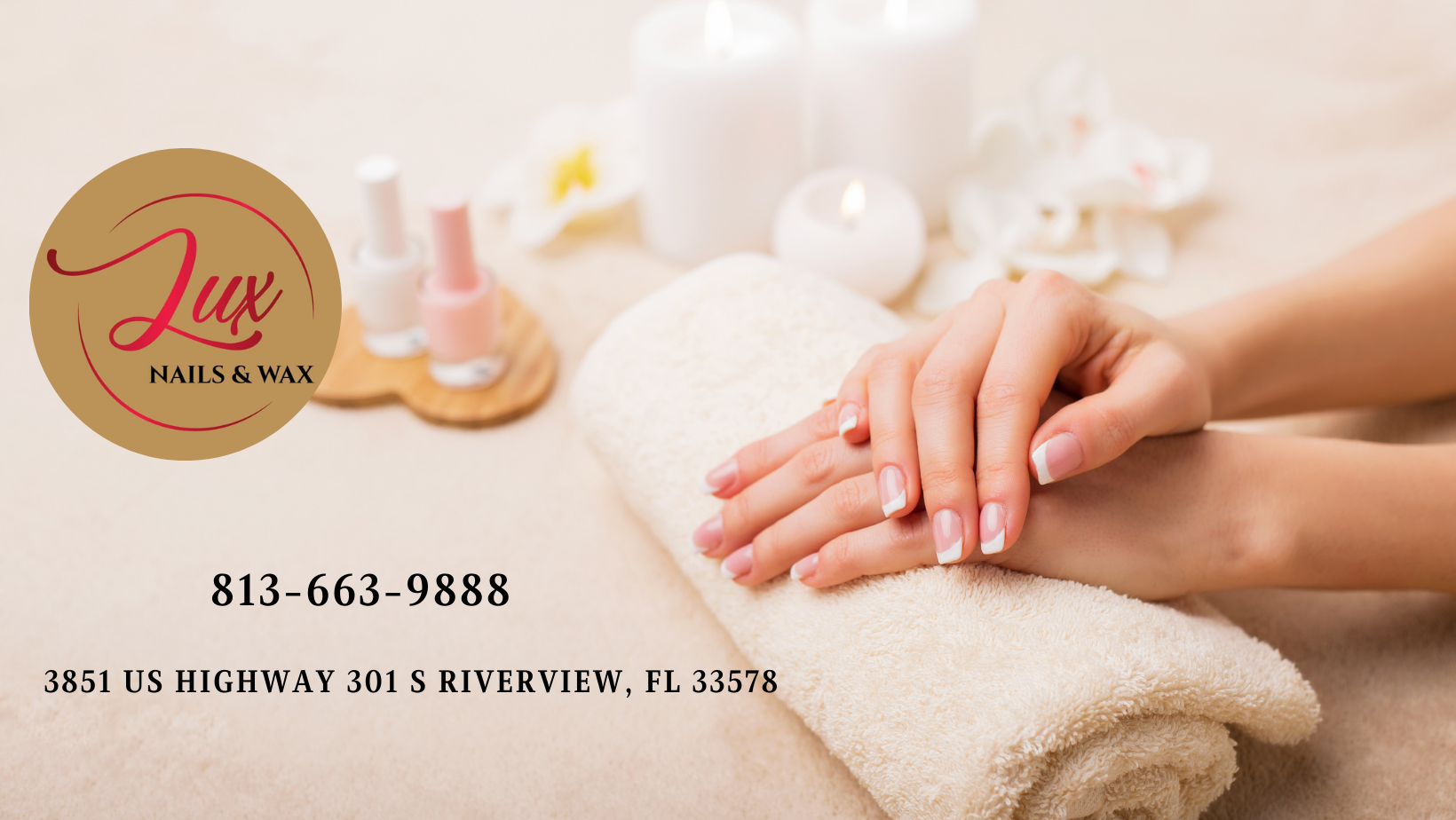 LUX NAILS & WAX SALON 3851 US HIGHWAY 301 S, RIVERVIEW, FL 33578 Experience the luxury of LUX NAILS & WAX SALON, FL 33578. We offer affordable manicure and pedicure services in a fun, welcoming environment. Our experienced staff uses quality tools and products to give you a professional treatment for your fingernails or toenails. We provide outstanding customer service by dedicating ourselves to creating long-lasting relationships with our clients, and we take pride in keeping our facilities clean. Get ready for the ultimate nail service experience! Let us pamper you today with the best services we offer. We are located at 3851 US HIGHWAY 301 S, RIVERVIEW, FL 33578.