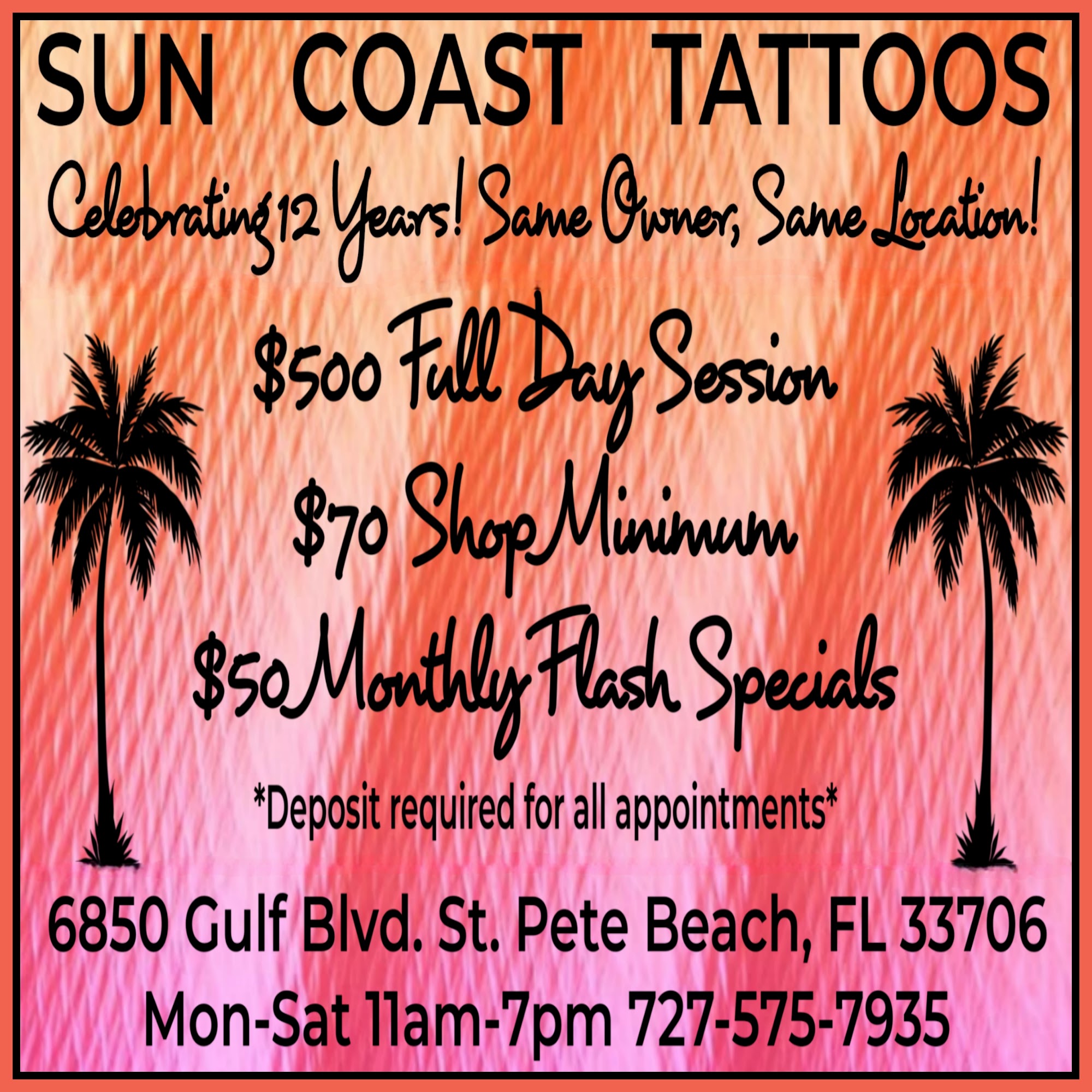 Went to Suncoast Tattoos to see Chris about an idea I had. He went above & beyond, place is chill & has nice people. Sanitary & friendly environment