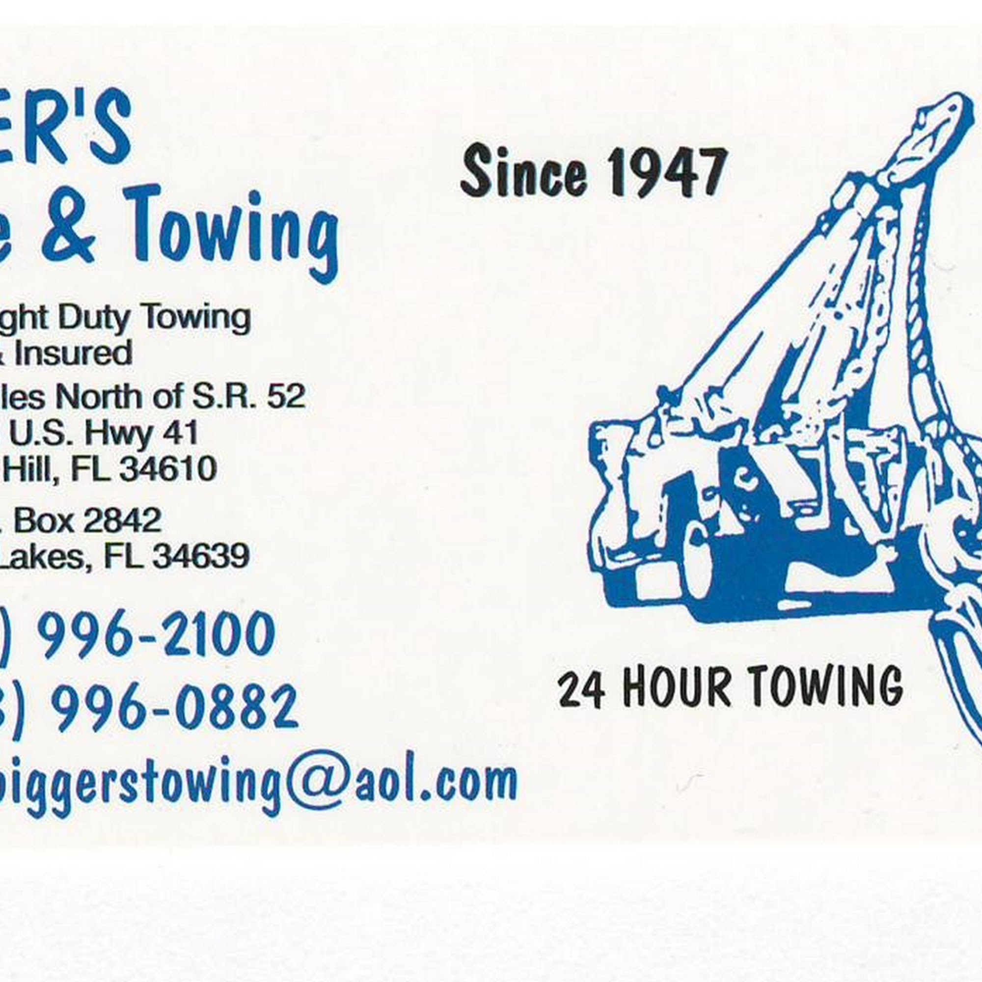 Bigger's Garage & Towing is a professional and reliable towing company located in Pasco County. Our drivers are very friendly and knowledgeable. We specialize in private impounds and accident towing. We are family-owned and operated. We provide great service and we take care of your property. Call us today for more information!