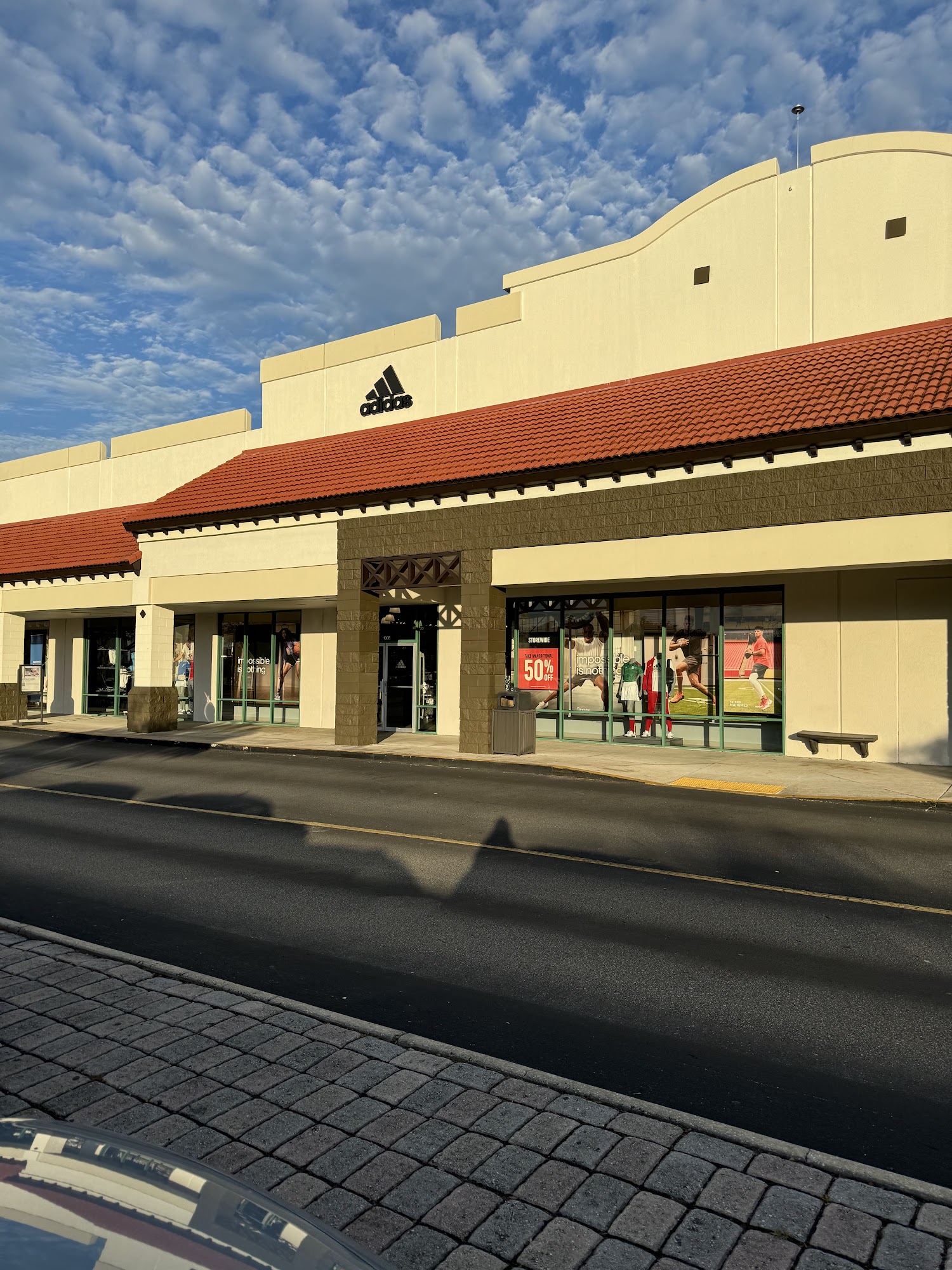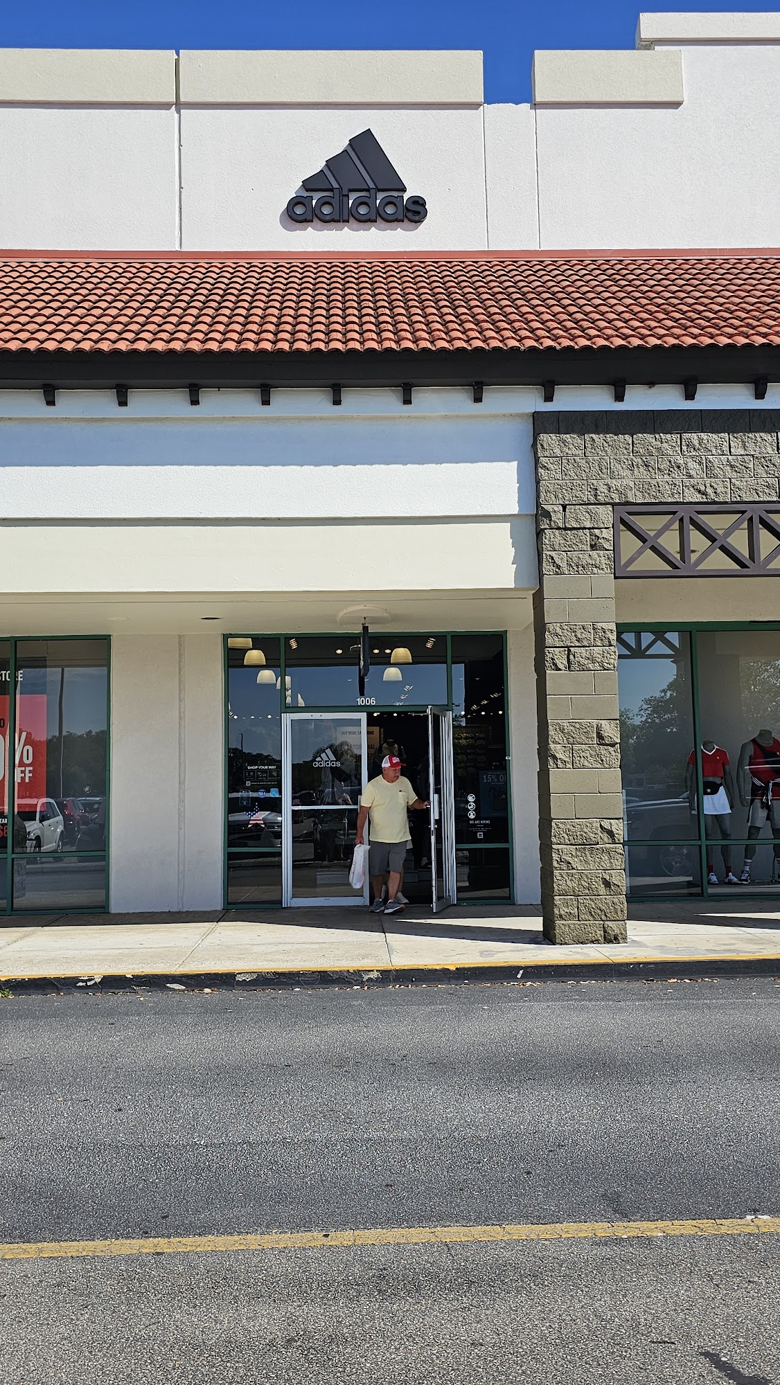 Great Adidas Outlet Store at the main entrance. Well stocked and very clean. Military Discount.