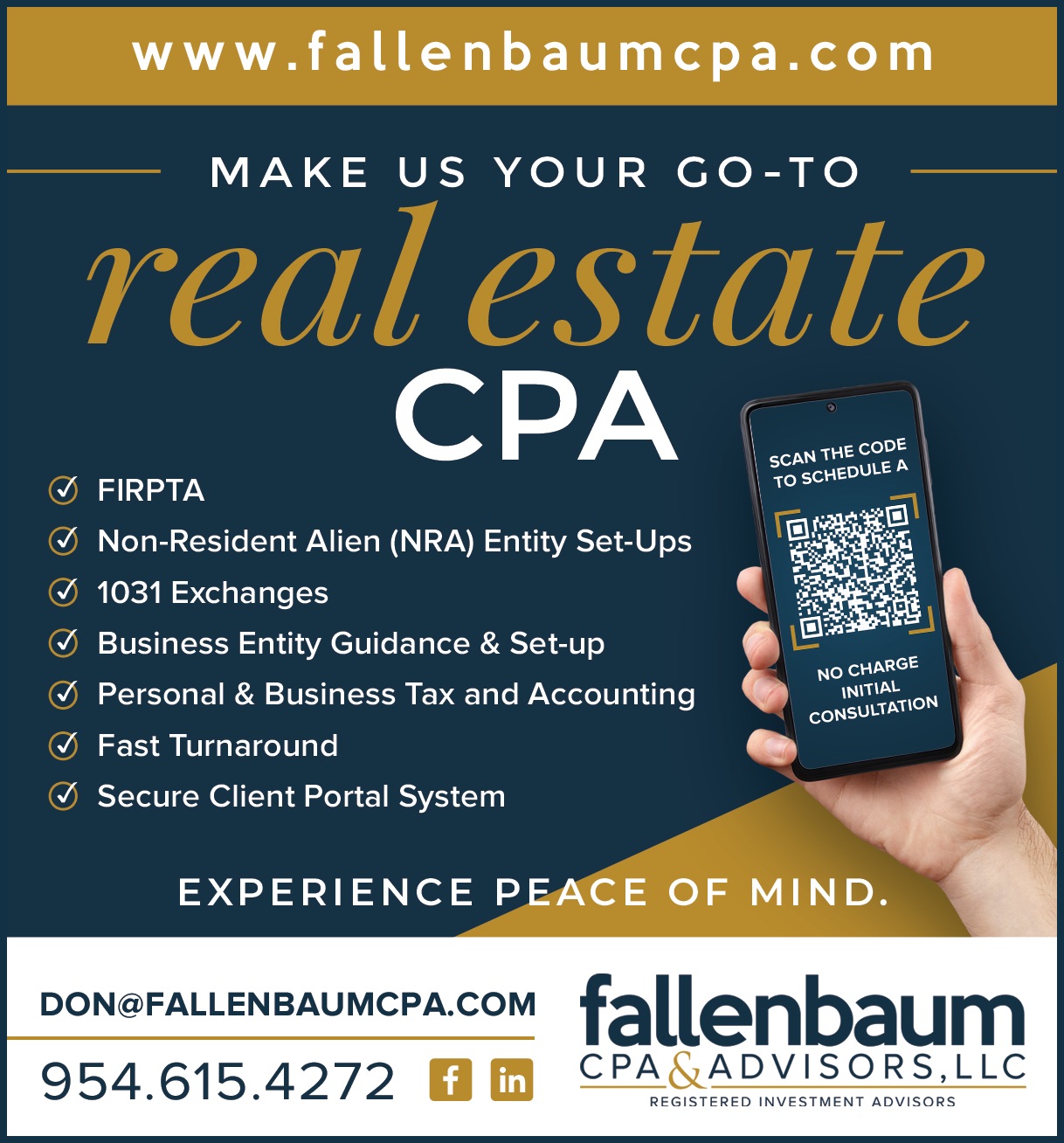 Fallenbaum CPA & Advisors LLC, located in Plantation, FL, has been a trusted financial partner for over 25 years, serving clients across South Florida and beyond. Known for their expertise in wealth management, they specialize in guiding individuals and businesses, particularly in the real estate sector, towards secure financial futures. Clients appreciate the professionalism, efficiency, and thoroughness of their services. Many have relied on their personal and business tax preparation, citing fast responses to tax questions and thoughtful recommendations. With a focus on updated technology and a commitment to client satisfaction, Fallenbaum CPA & Advisors LLC is highly recommended for anyone seeking reliable financial advice and planning.
