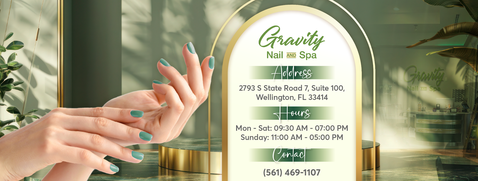 Welcome to Gravity Nails & Spa in Wellington! Conveniently located at 2793 S State Road 7, Wellington, FL 33414, we offer manicures, pedicures, waxing, and more. Whether you need a quick touch-up or a full spa treatment, our friendly team is here to help you relax and feel your best. Walk-ins are always welcome! Come visit us for top-quality nail care in a comfortable setting.