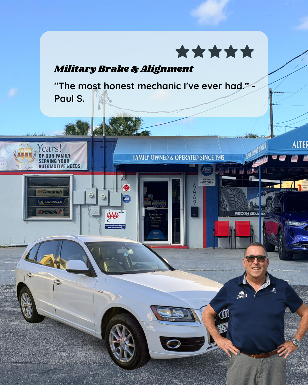 Military Brake & Alignment is a trusted auto repair shop that has been serving the West Palm Beach community since 1985. The team of ASE Certified technicians is passionate about providing reliable and dependable services to their customers. They take the time to get to know each customer and their vehicle, ensuring accurate diagnoses using state-of-the-art equipment. Customers praise the shop's honesty, integrity, and the extra mile the team goes to ensure satisfaction. Whether it's a routine maintenance or a complex repair, Military Brake & Alignment delivers timely, fairly priced, and professional service. Customers consistently recommend the shop for its positive attitudes, knowledgeable staff, and commitment to keeping their vehicles in top shape.