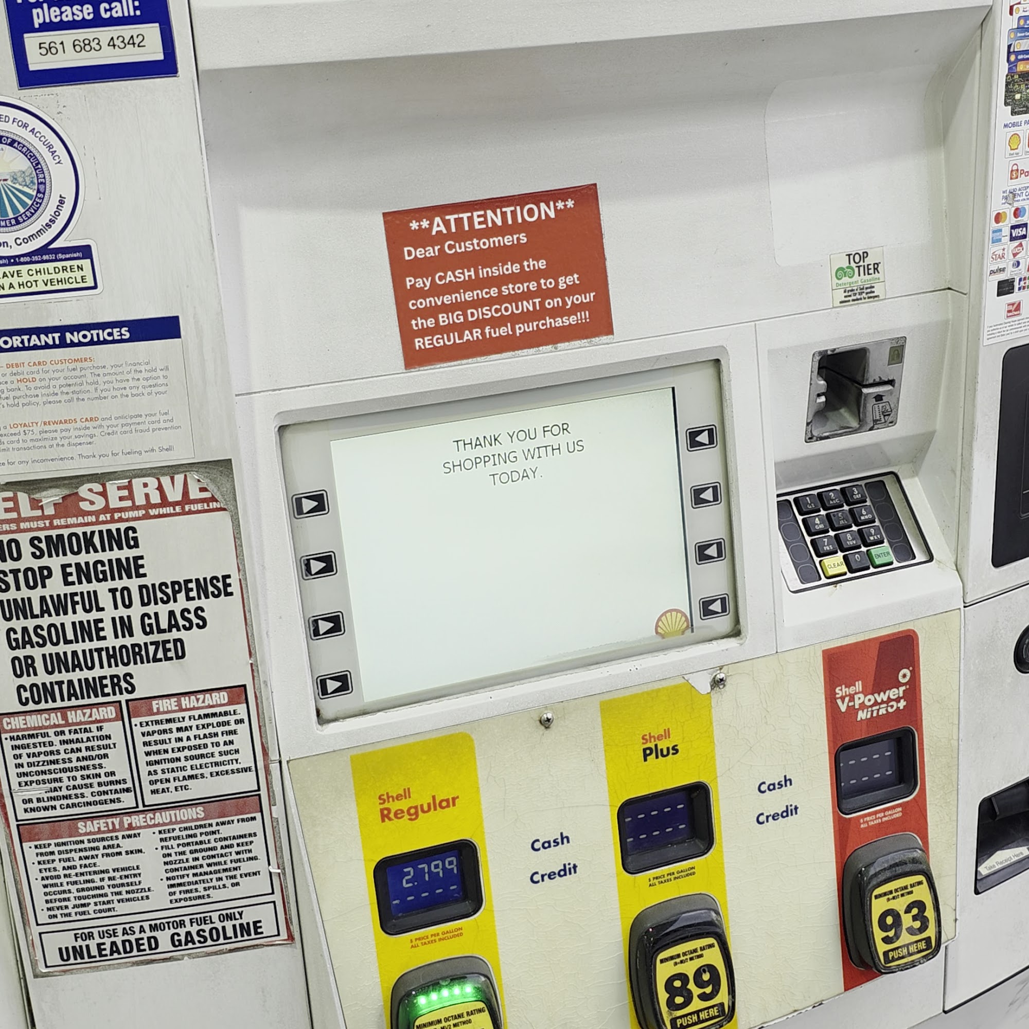 Complete rip-off $1 more per gallon if you use a debit card. 95% of people use debit cards. This needs to be reported to Shell and the attorney general office. Also the ATM has a $5 fee...