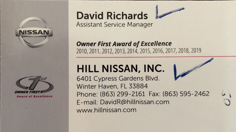 Jeffrey was great & helped me get into the car I wanted for the price point I wanted. Great service! The whole team was great. This is my second car with hill Nissan. Definitely will be coming here again when I plan to purchase again