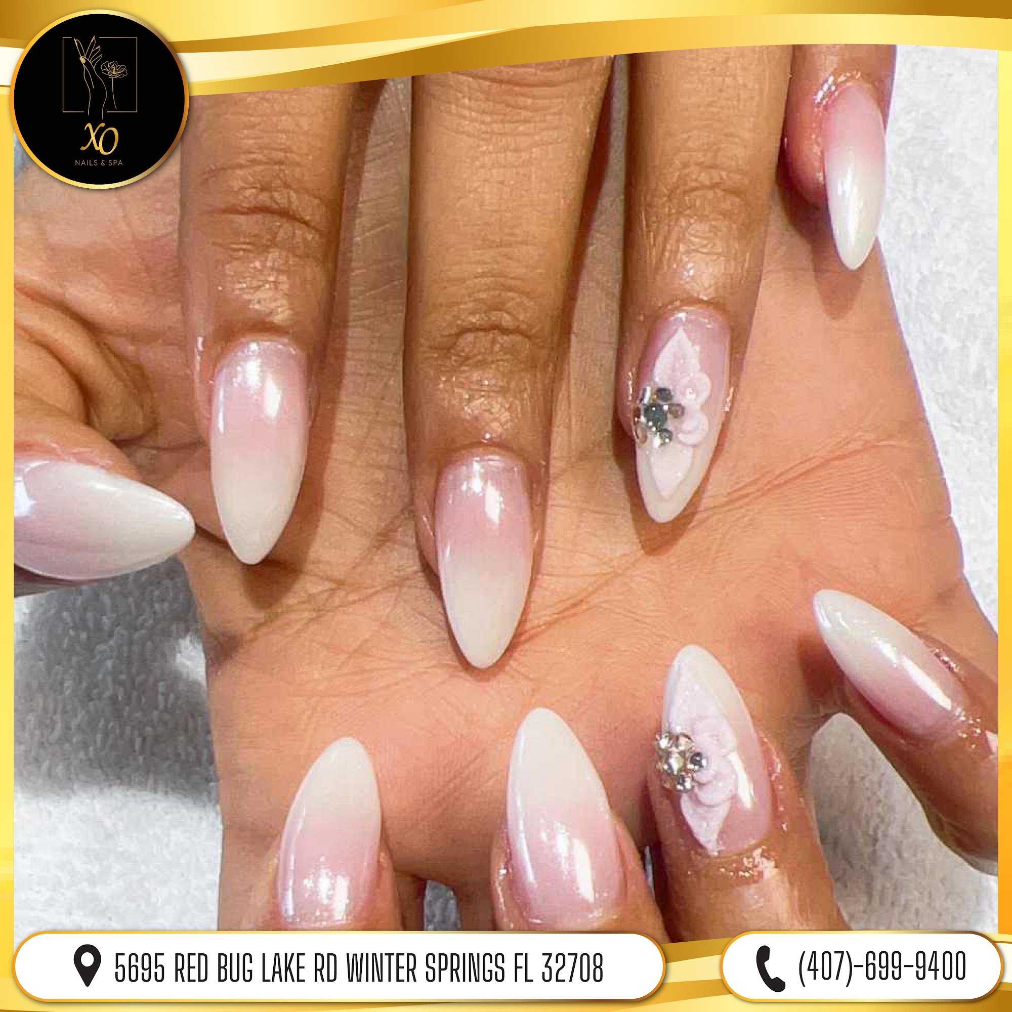 Welcome to X.O Nails & Spa. We are conveniently located in Willa Springs plaza on Red Bug Lake and Tuskawilla. Our goal is to make each client feel comfortable and provide the highest level of customer service as well as quality and rejuvenating experience. Appointment is highly recommended~ walk-ins are welcomed.