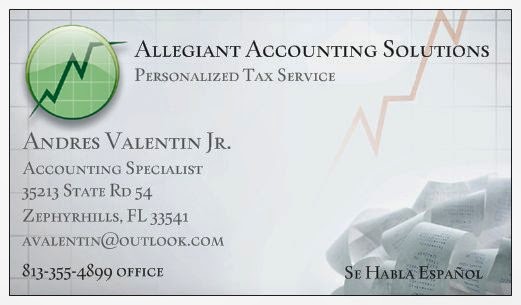 For tax preparation in Zephyrhills FL, you can count on Andres Valentin at Allegiant Accounting Solutions. Andres Valentin assists taxpayers and small businesses with taxes in Zephyrhills FL and the surrounding communities. Whether you are an individual or a local business in or around Zephyrhills FL, Andres Valentin has years of valuable experience as an IRS registered tax preparer. Contact Andres Valentin, tax filing specialist in Zephyrhills FL, for help with your taxes.