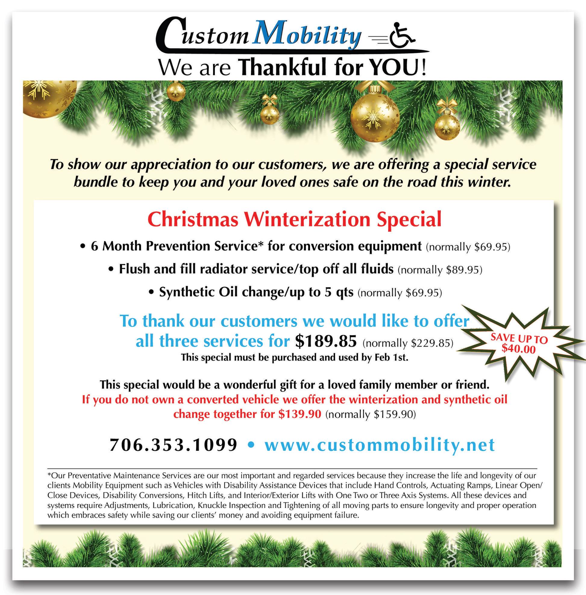 Always have great service at Custom Mobility. Definitely recommend for any handicap accessible vehicles you need serviced, or to purchase one! Good, honest, & helpful people.