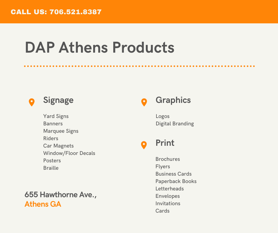 DAP Athens did an amazing job on my new office sign. Melonee came into my office, took exact measurements and made the perfect sign! Thanks DAP Athens!!