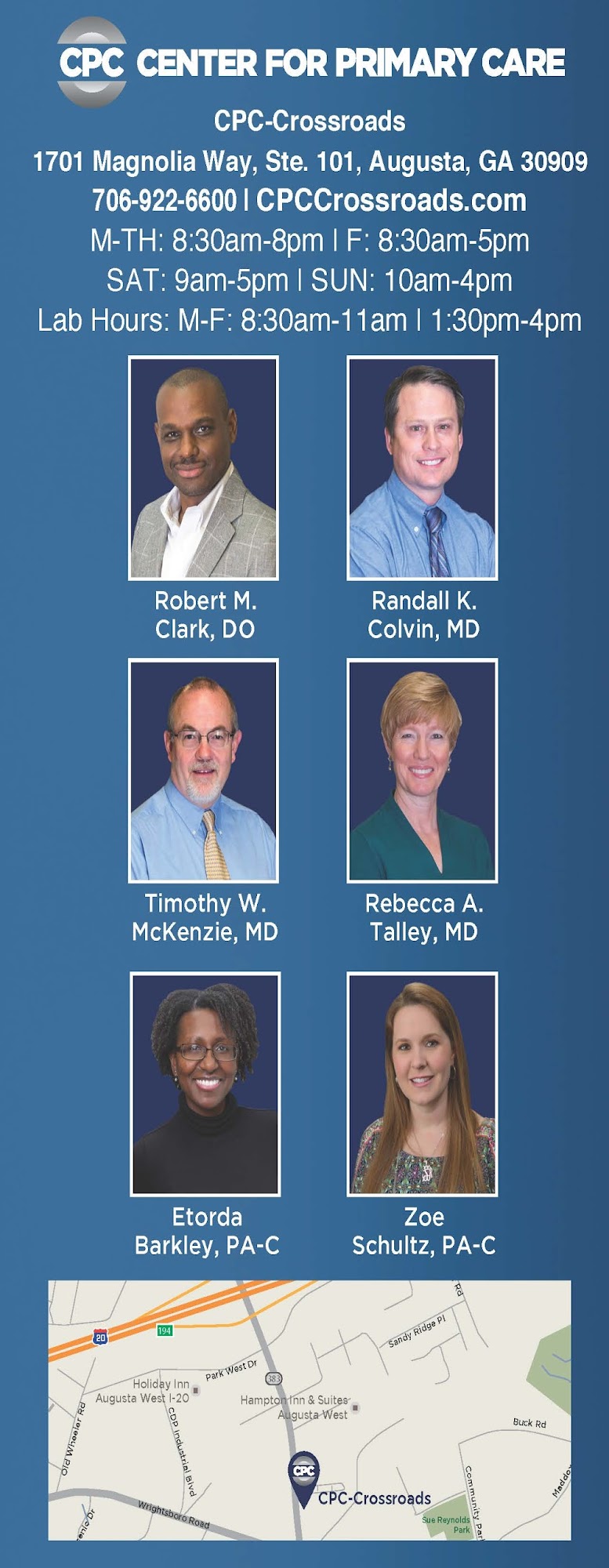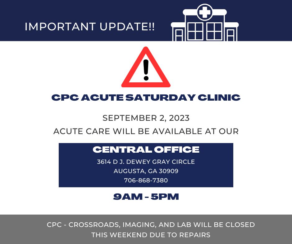 Center For Primary Care (CPC) is a family and internal medicine practice with 37 physicians and 8 offices across the CSRA. All of our offices have weekday evening hours. CPC-North Augusta and CPC-Crossroads offers Acute Care Weekend Hours for established CPC patients. CPC's physicians provide comprehensive care for patients of all ages, and diagnostic imaging services, including x-ray, MRI, CT, DEXA bone density testing, stress testing, ultrasound and echocardiography