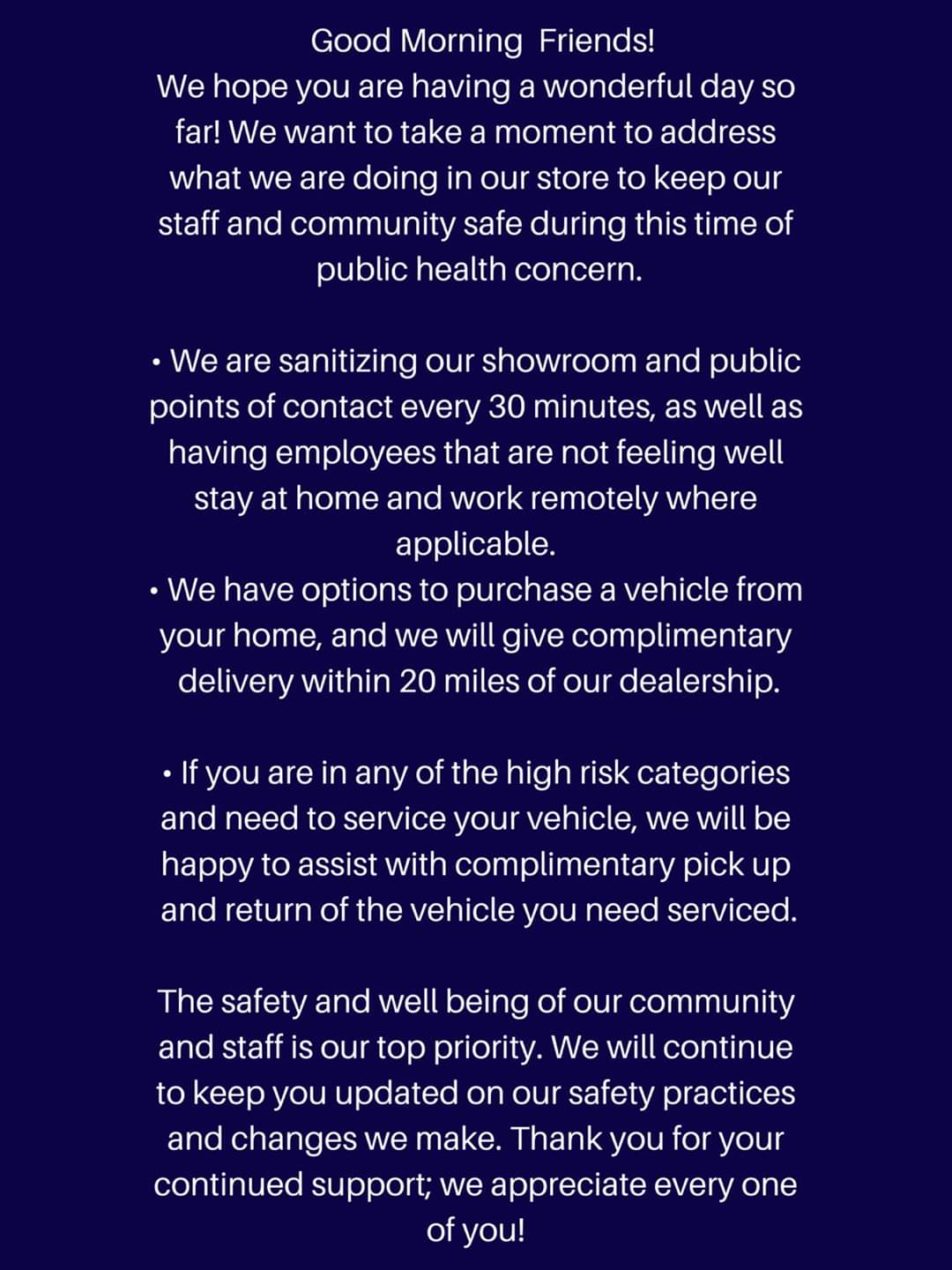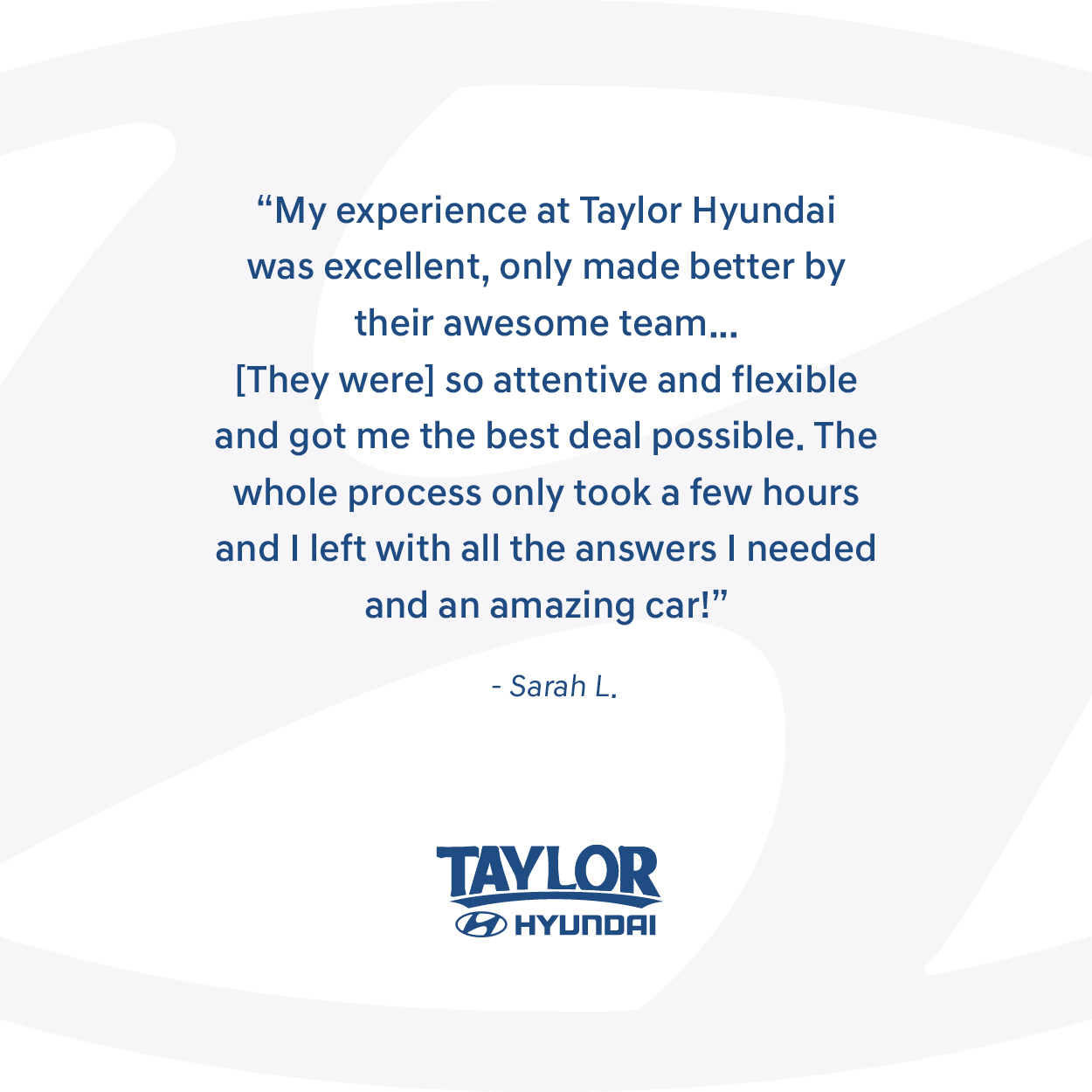 The whole team at Taylor Hyundai took good care of me. My salesperson, Tianna Clark, was so pleasant and patient with all my questions. She didn’t hesitate to make sure I got to see in person the car that most interested me. This was a great buying experience!