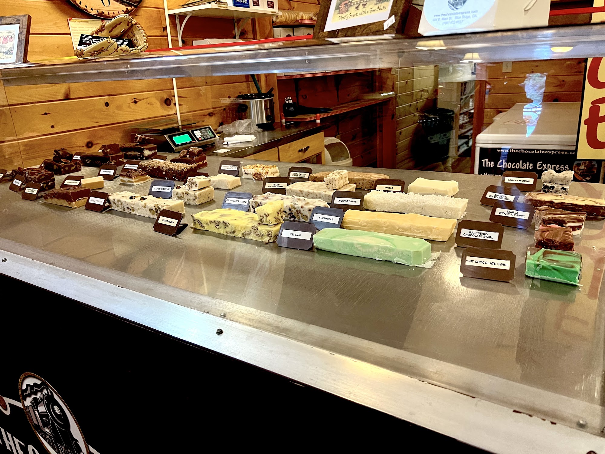 The Chocolate Express offers fine gourmet chocolates and truffles, along with fudge and ice cream. The truffles are delicious, to die for, and perfection, with specific praise for the dark chocolate raspberry, Expresso, blueberry, and Key Lime varieties. The fudge is described as creamy, good, the best in the area, and very close to the best. However, the snickers fudge is a letdown, noted as just chocolate fudge with a layer of peanuts. The ice cream is decent but has fewer flavors than most. The staff is very kind and provides good, timely service.