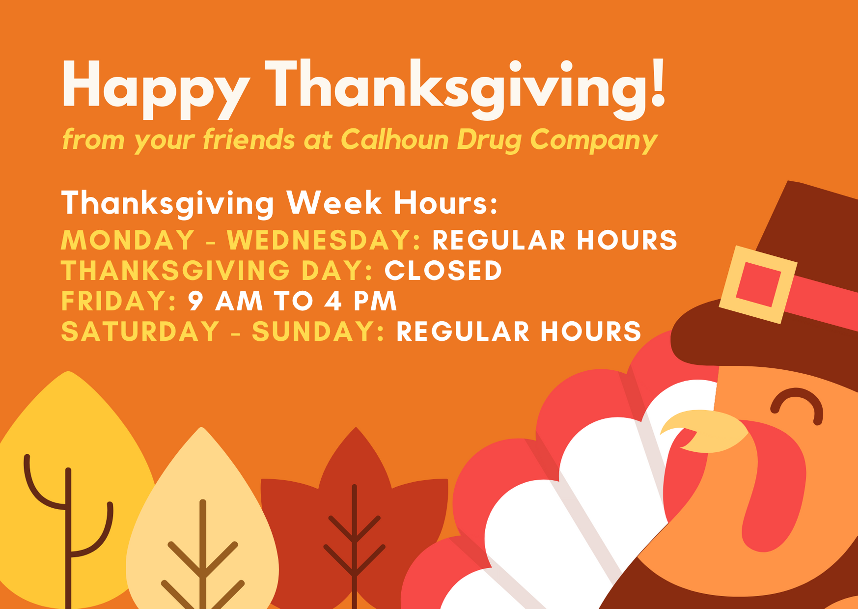 I feel like I am part of the family,here at Calhoun drug company, I feel like they actually take the time to get to know me and and they will also let me know when my meds are delayed or when it's on back order so I don't have to wait in contacting my Dr and having him/ her send a request to another pharmacy!