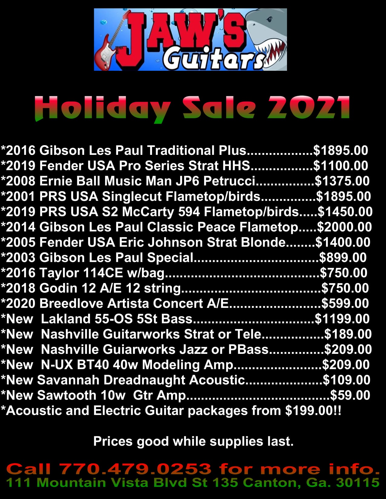 JAWS GUITARS is an absolute gem and the best place for anything guitar. They buy, sell, trade, and consign new and preowned guitars, amplifiers, drums, PA, and all accessories. The shop offers lessons, guitar and amp repairs, and has the largest selection of guitar and bass parts in the Atlanta area. The workmanship is impeccable, the playability is top-tier, and the tone is incredible. It is a great place for good little deals and has a good selection of instruments for a small shop, with a variety from rare to common, cheap to high-end. The prices are all very fair, realistic, and competitive. Their customer service is outstanding, friendly, knowledgeable, and always willing to go the extra mile. The owner is very nice, personable, and friendly. Expert repairs and setups are done fast, cheap, and very well. Established in Florida in 1999, they are now located at 111 Mountain Vista Blvd Ste 135 in Canton.