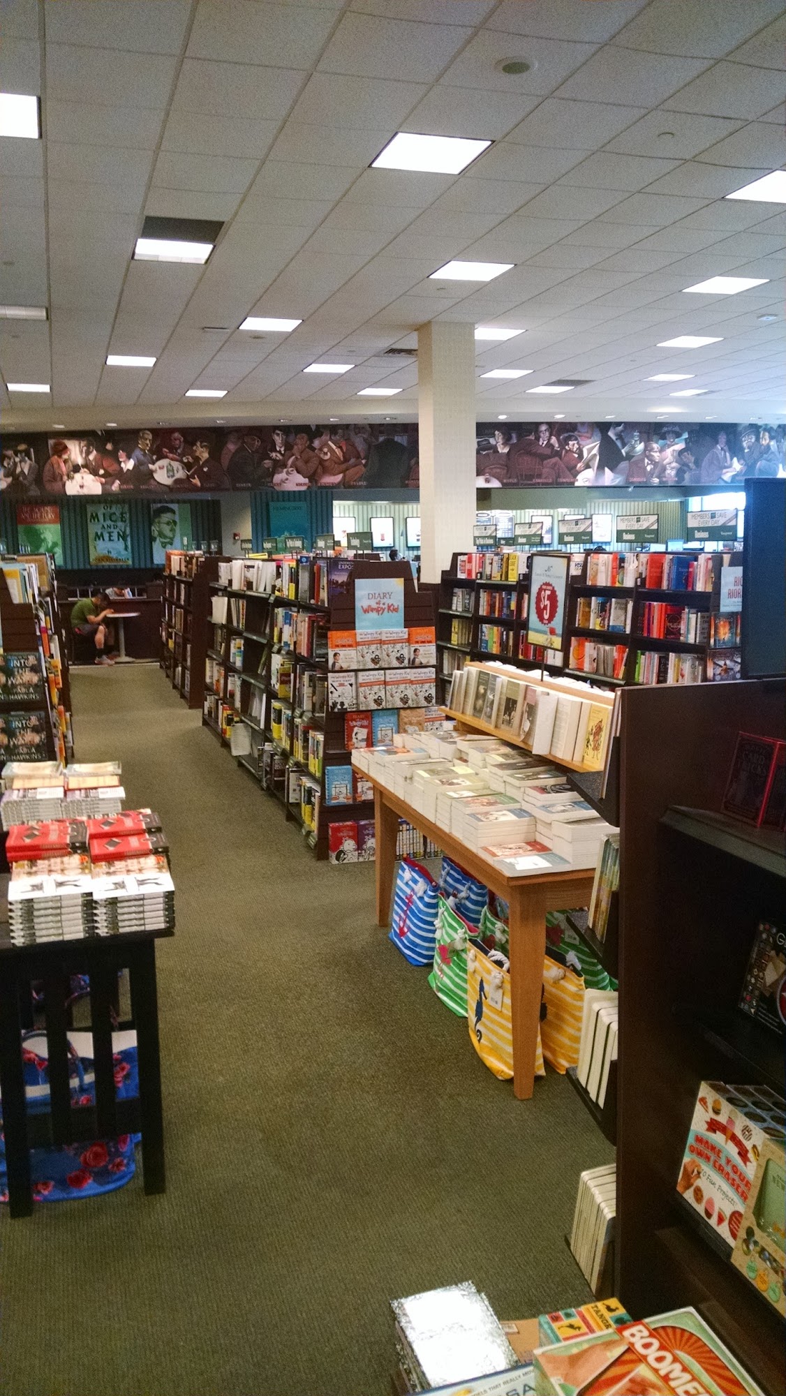Barnes & Noble is a good-sized store with a beautiful, clean environment and an extensive variety of books, card games, board games, manga, and more for all genres. The staff is consistently friendly, helpful, and provides outstanding customer service. It is a comfortable place to get a drink or eat while reading. However, the men's bathroom is noted as being consistently nasty. Overall, it is a recommended place to find what you are looking for.