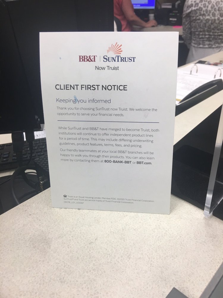 Suntrust the bank has been an entity that's been consistently defining themselves by a stream of non-customer-centric practices for years now, but the people at this branch are fine, and seem to generally take their jobs seriously - maybe a bit too seriously for millennial tastes