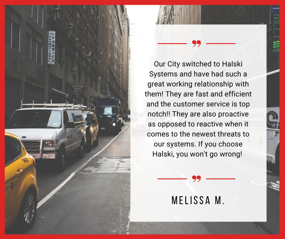 Our City switched to Halski Systems and have had such a great working relationship with them! They are fast and efficient and the customer service is top notch!! They are also proactive as opposed to reactive when it comes to the newest threats to our systems. If you choose Halski, you won't go wrong!