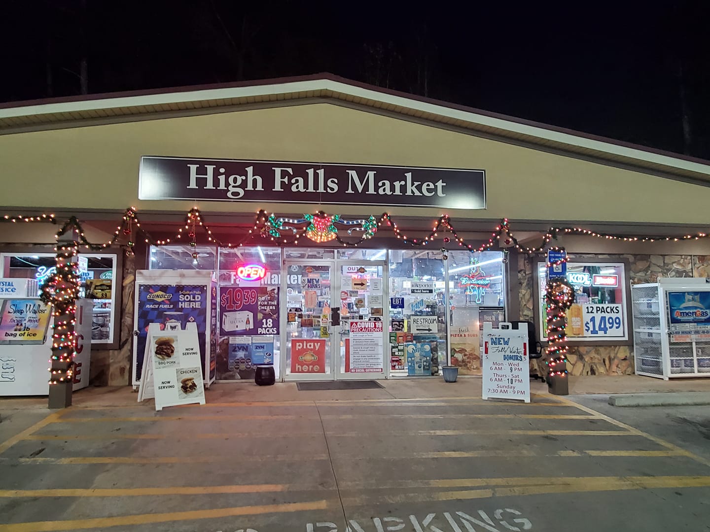 I stopped in to High Falls Market with a flat on front of my car. A nice young man ma’am Ed Brian who worked there put my spare on the car and changed the tires around for me. The owner brought an hydraulic jack out to help. Wow!!! Bran at High Falls Market and the owner are my hero’s!!!!!! Thank you so much!