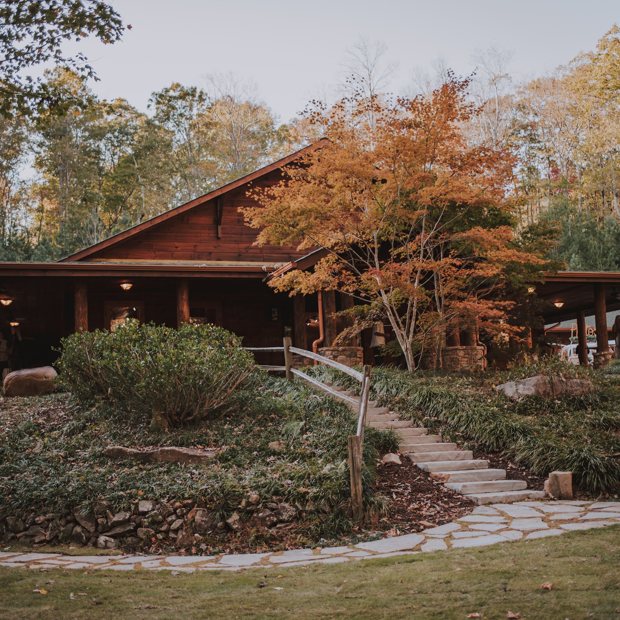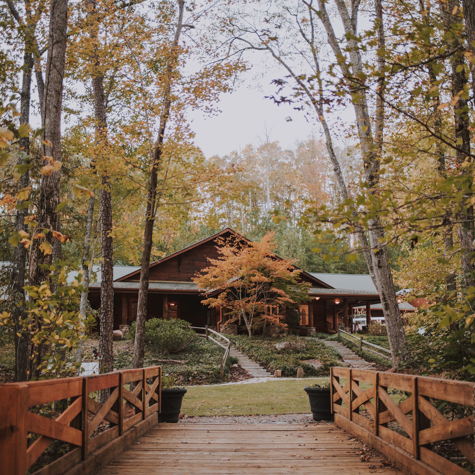 The Lodge at Old Mill is a beautiful and spacious event venue located on over six wooded acres in North Georgia. It features a 10,000-square-foot authentic log lodge with a white-washed interior, a custom bar, and a large floor-to-ceiling stone fireplace, creating a warm and inviting atmosphere. The venue is ideal for weddings, with a dedicated bridal suite that includes a kitchen, a spacious great room, and two dressing rooms, each with its own full bath. There is also a grooms cabin with porches and a loft, perfect for preparing for the big day. The Lodge can host large gatherings of over 250 guests, offering three main areas: the indoor Ballroom, and the outdoor Creekside and Firefly spaces. The outdoor grounds are stunning, with old, heavy wooden entry doors, a wooden bar, and a wrap-around patio, as well as beautiful pathways and fall foliage that make for a perfect backdrop for photos and ceremonies. Guests and clients praise the venue for its beauty, helpful staff, and well-coordinated events. Debbie and her team are highly appreciated for their care, helpfulness, and ideas that help make each event special. Overall, The Lodge at Old Mill is considered a top choice for weddings and large celebrations, offering a scenic country setting combined with excellent facilities.