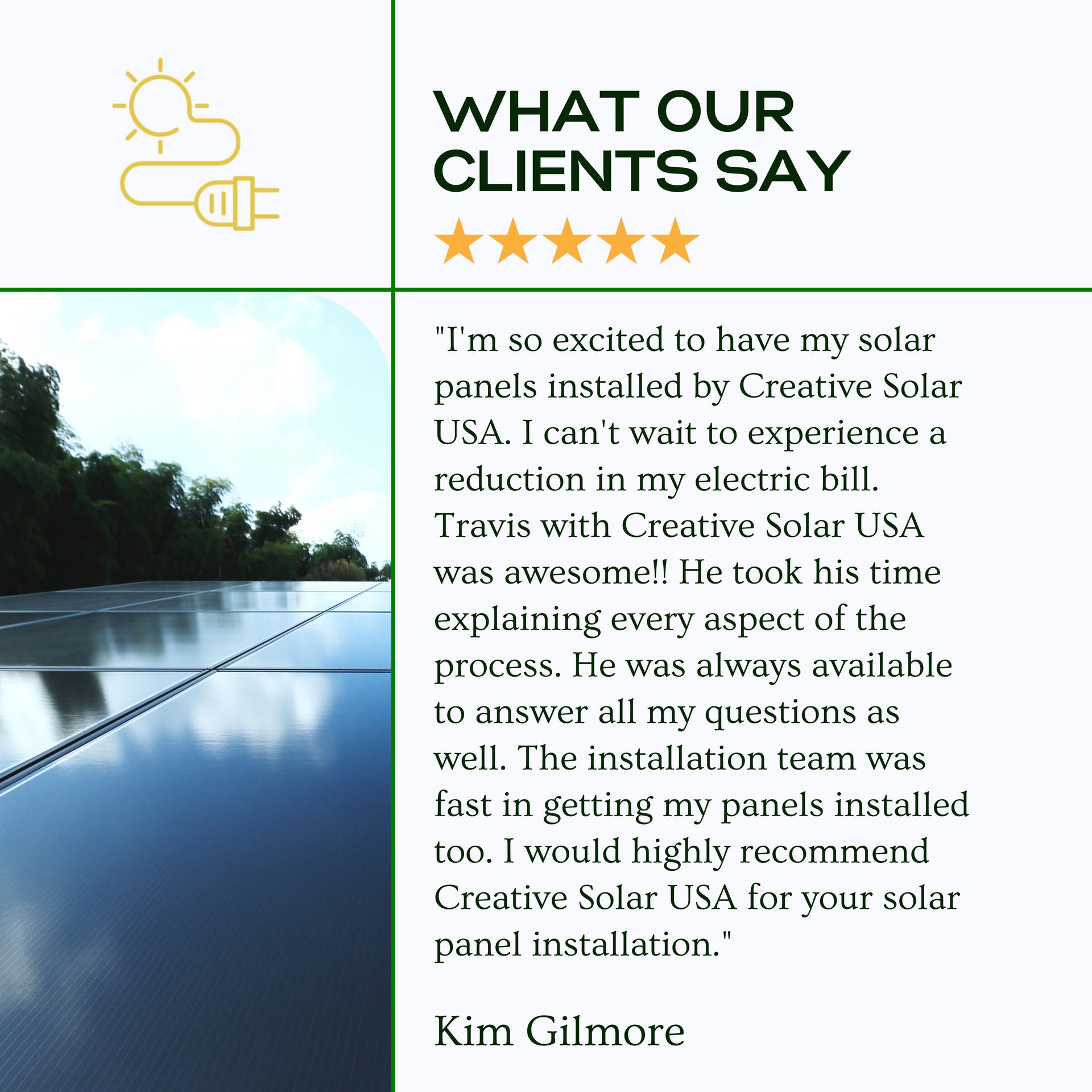 Walked us through the entire process and delivere a great solar system. Last month our power bill was 17$. They've been great about coordinating lobbying the PSC to improve access to net metering, too. I think anyone looking for solar in Georgia should work with Gustavo and Creative Solar, USA.