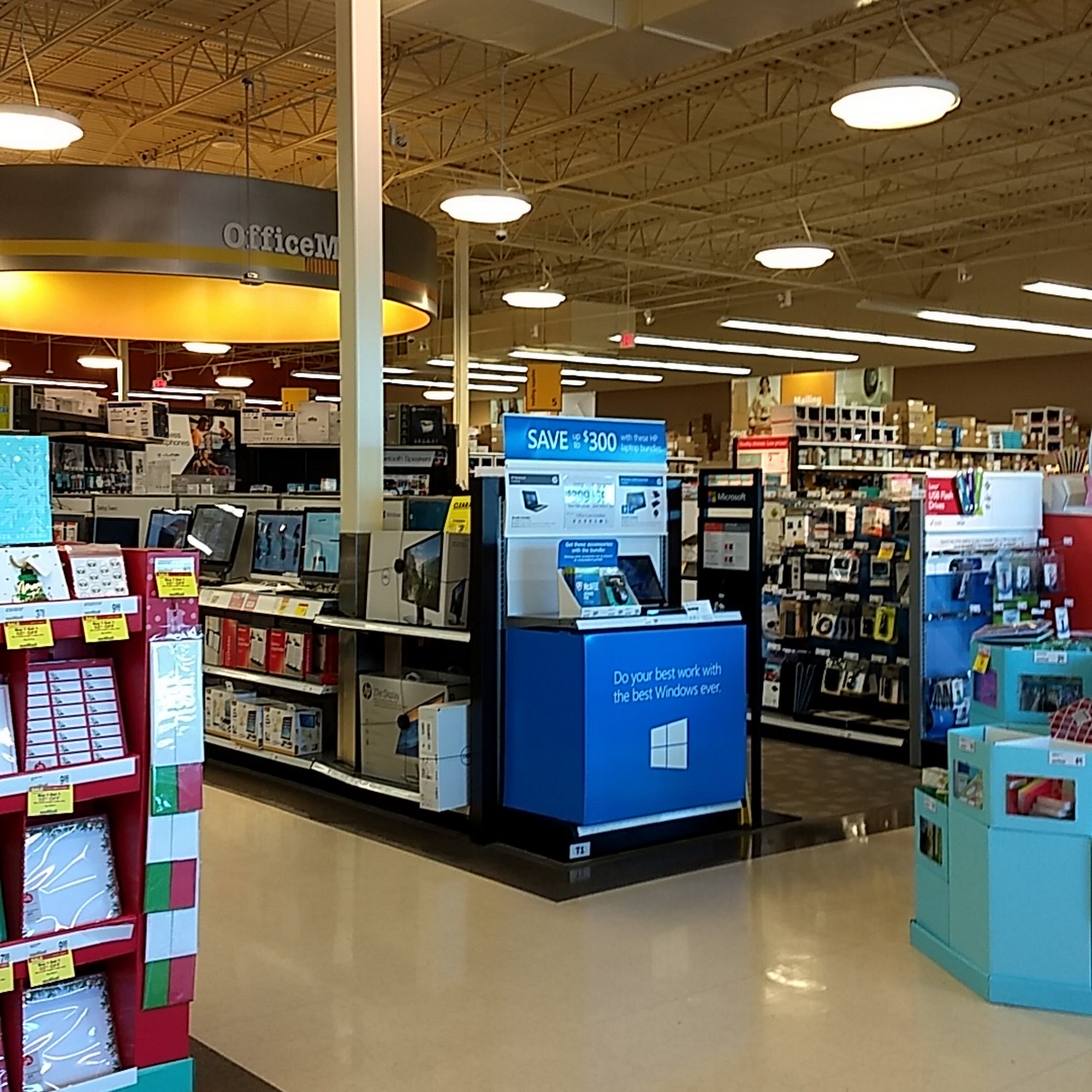 OfficeMax is a convenient store that now offers curbside pickup for online and app orders. Customers can park in designated spots and use the "I'm Curbside" button to receive their orders quickly. The store provides a wide range of office supplies, including paper, ink, furniture, technology, and cleaning products. It also offers business services like custom printing, shipping, and tech support. The staff is known for being helpful, courteous, and professional, with employees working well together to assist customers with various needs. The store is clean, well-stocked, and friendly, creating a positive shopping experience. Customers highlight excellent service from staff members, especially noting a phenomenal manager and a helpful printing center employee. Visitors appreciate the quality of products like post-it notes and the overall helpful attitude of the team, making OfficeMax a reliable destination for business and home office supplies.