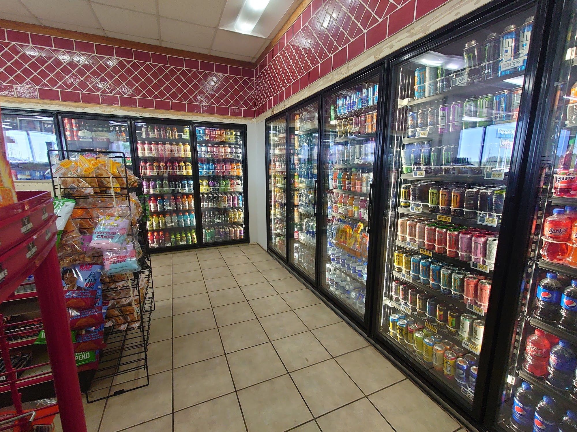 Great snack selections, nice staff, reasonable gas prices and a huge area to walk the dogs.