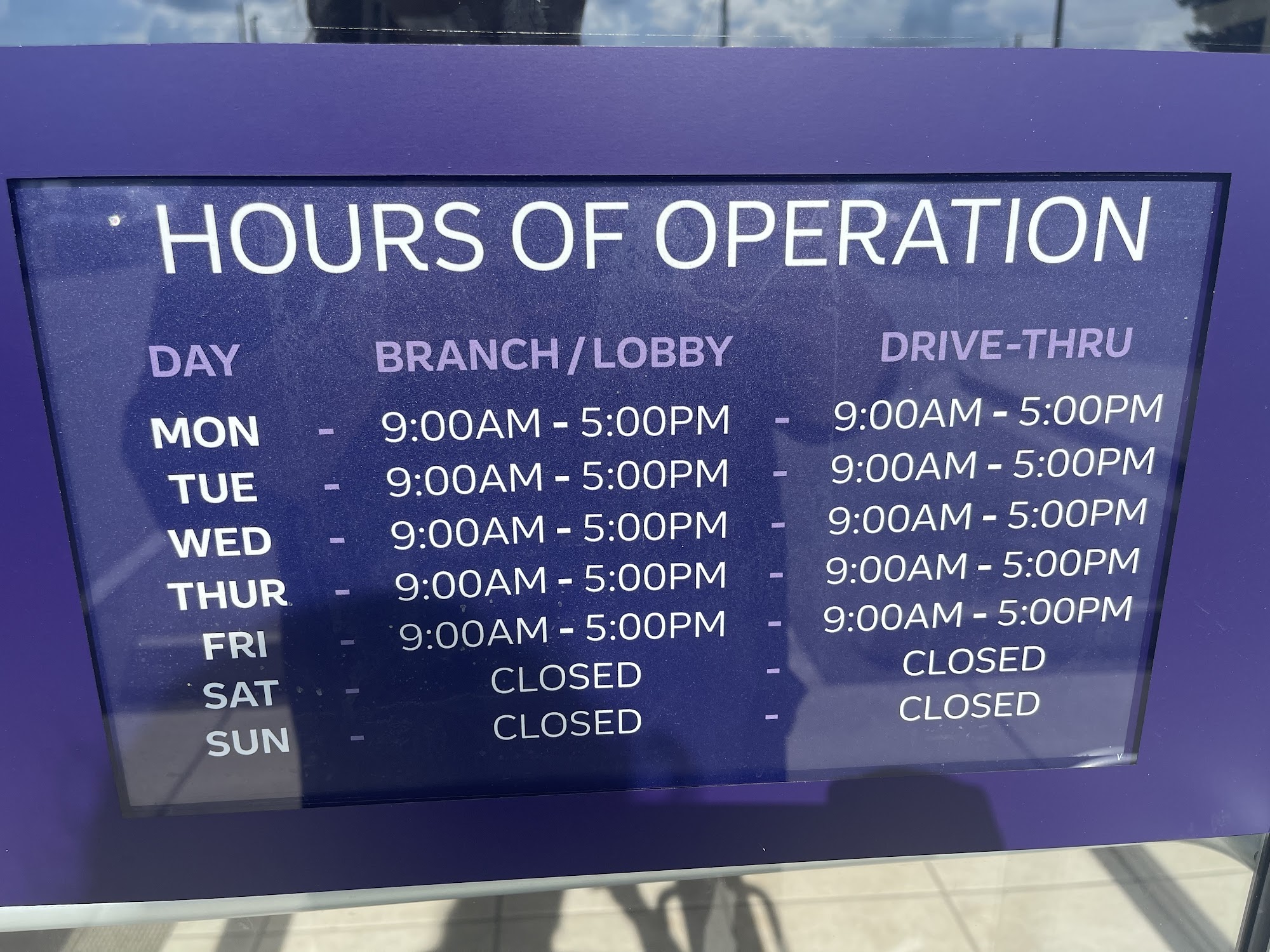 The posted hours are not accurate. I've tried to make deposits on saturdays before noon and they'll be closed.