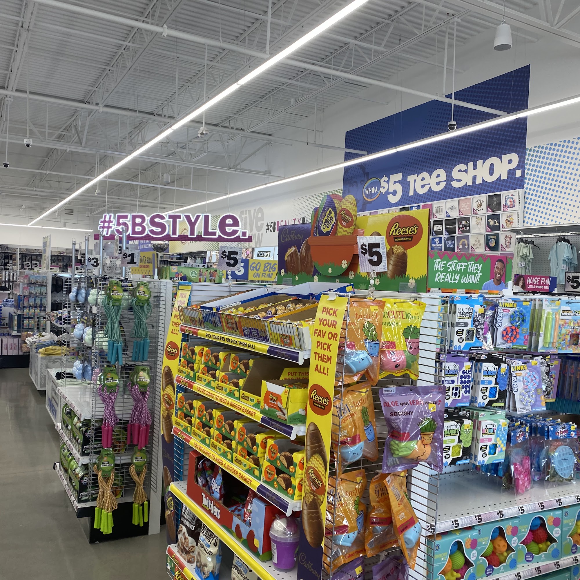 Five Below is a store with a great selection of affordable merchandise, where most items are cheap and under ten dollars. It features toys, art things, clothes, fun little tee shirts, electronics accessories, sporting equipment, and lots of candy. Customers love the 'occasion' card selection and price. The staff and crew are described as ultra friendly, nice, and providing friendly service. While the candy can be a bit overpriced, the store is noted for having better quality than the Dollar Tree and great deals. It is a great place for birthdays and all holidays, with something for all occasions. Some note that checkout lines can be long.