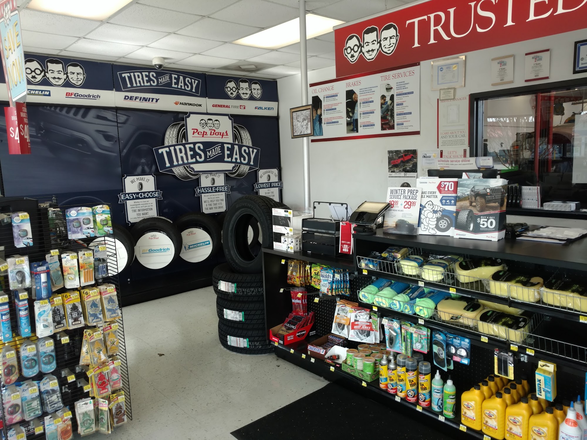 Had a gouged tire on the way home to Covington. Stopped at pep boys for some help, ended up buying 4 brand new tires at a great price. They were so helpful in getting them installed fast so we could get back on the road. Glad we stopped here.